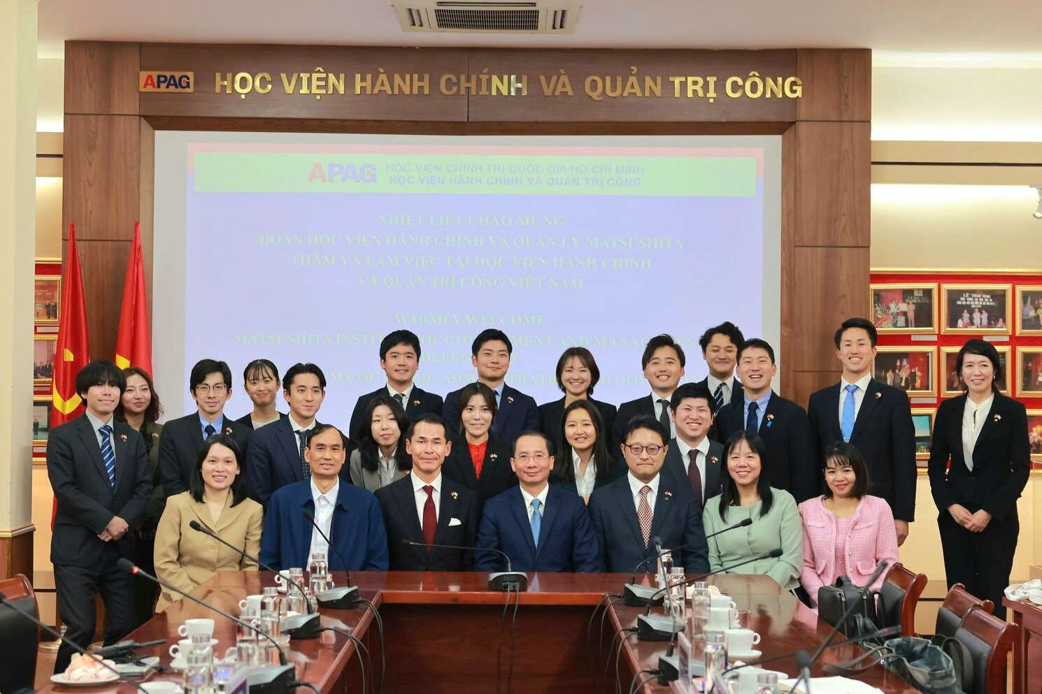(apag.edu.vn) - Sáng ngày 26/11/2025, Học viện Hành chính và Quản trị công đã trang trọng đón tiếp và làm việc với Đoàn cán bộ lãnh đạo, học viên Học viện Hành chính và Quản lý Matsushita (MIGM), Nhật Bản) gồm 19 thành viên sang thăm và nghiên cứu thực tế về hệ thống chính trị, hành chính công tại Việt Nam. Đoàn do ông Kenji Ozeki, Giám đốc Học viện Quản trị và Quản lý Matsushita làm Trưởng đoàn.