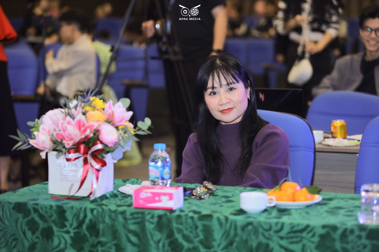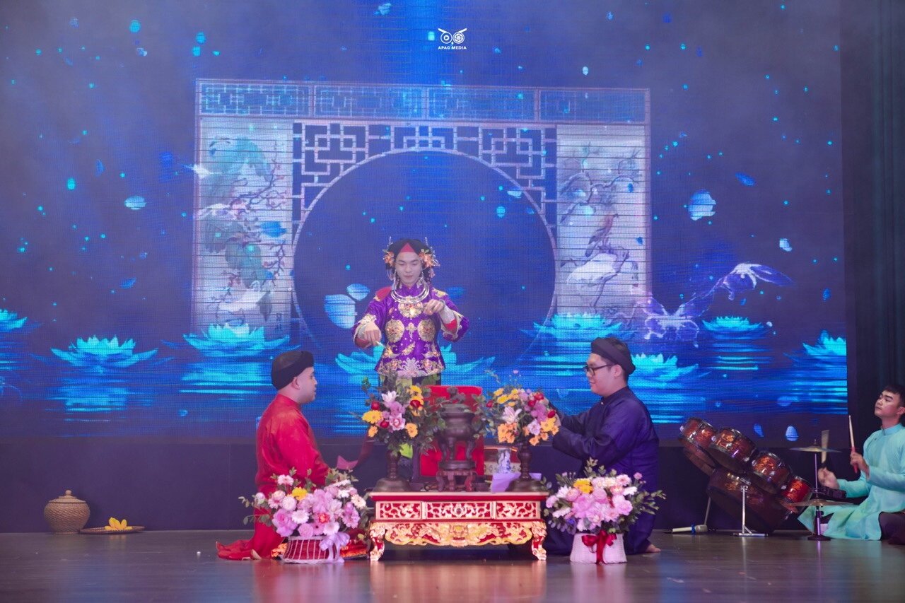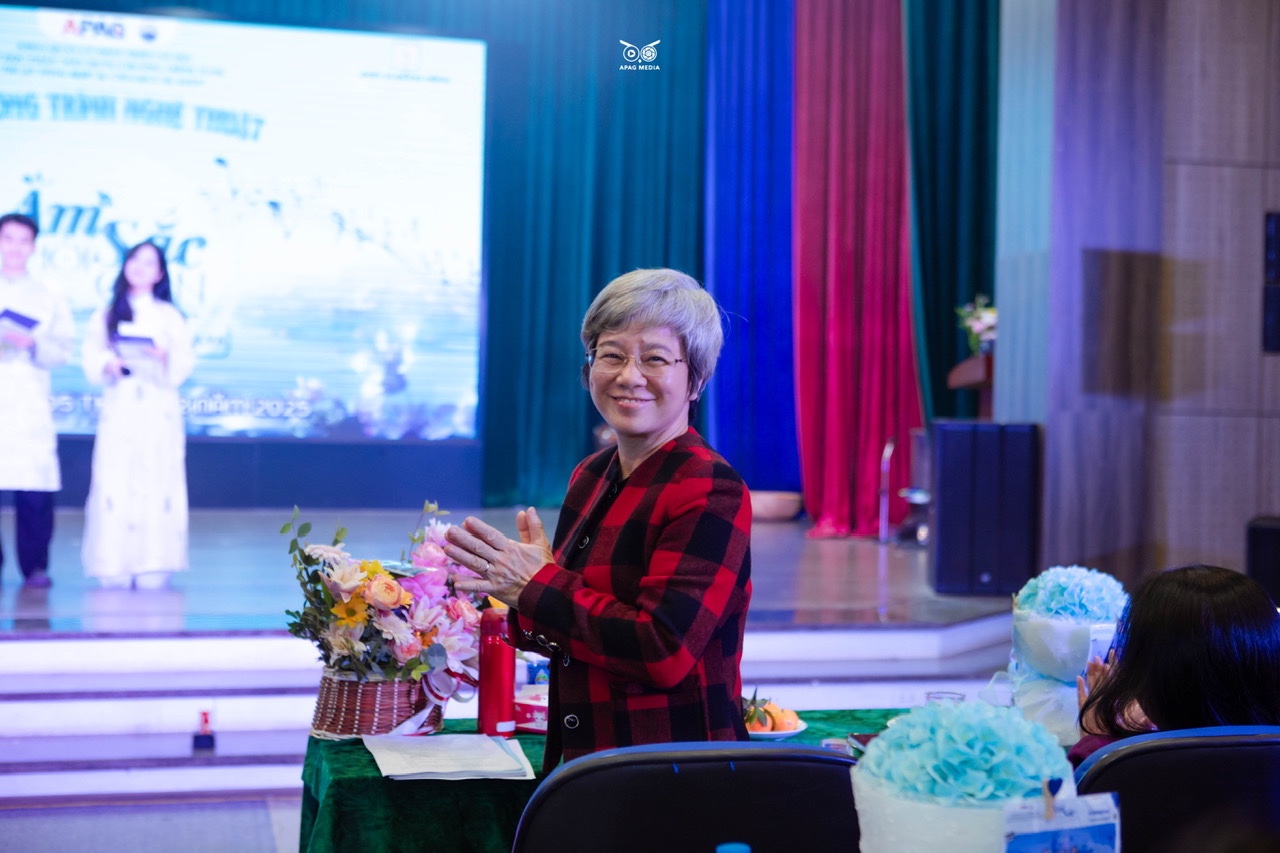 ThS. Lê Thị Thơm (áo trắng), giảng viên Khoa Quản lý phát triển xã hội phụ trách học phần Tổ chức sự kiện.Với thời lượng hơn hai giờ, “Âm sắc thời gian” dẫn dắt người xem qua hành trình cảm thụ nghệ thuật với những giai điệu chèo, dân ca, xẩm, chầu văn khắc họa rõ nét thông điệp mà lớp 2305QLVA sáng tạo và muốn gửi gắm “Vang vọng truyền thống - hòa nhịp hôm nay”, nơi quá khứ truyền cảm hứng cho hiện tại và mở đường cho những giá trị văn hóa mới.