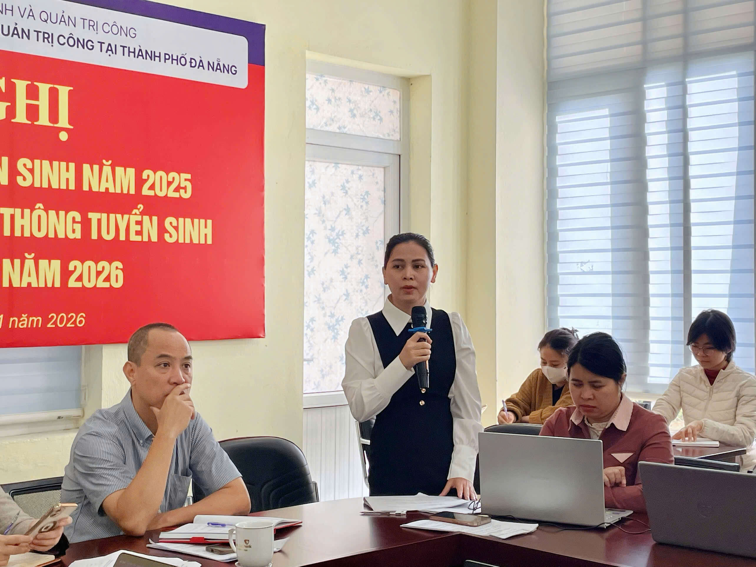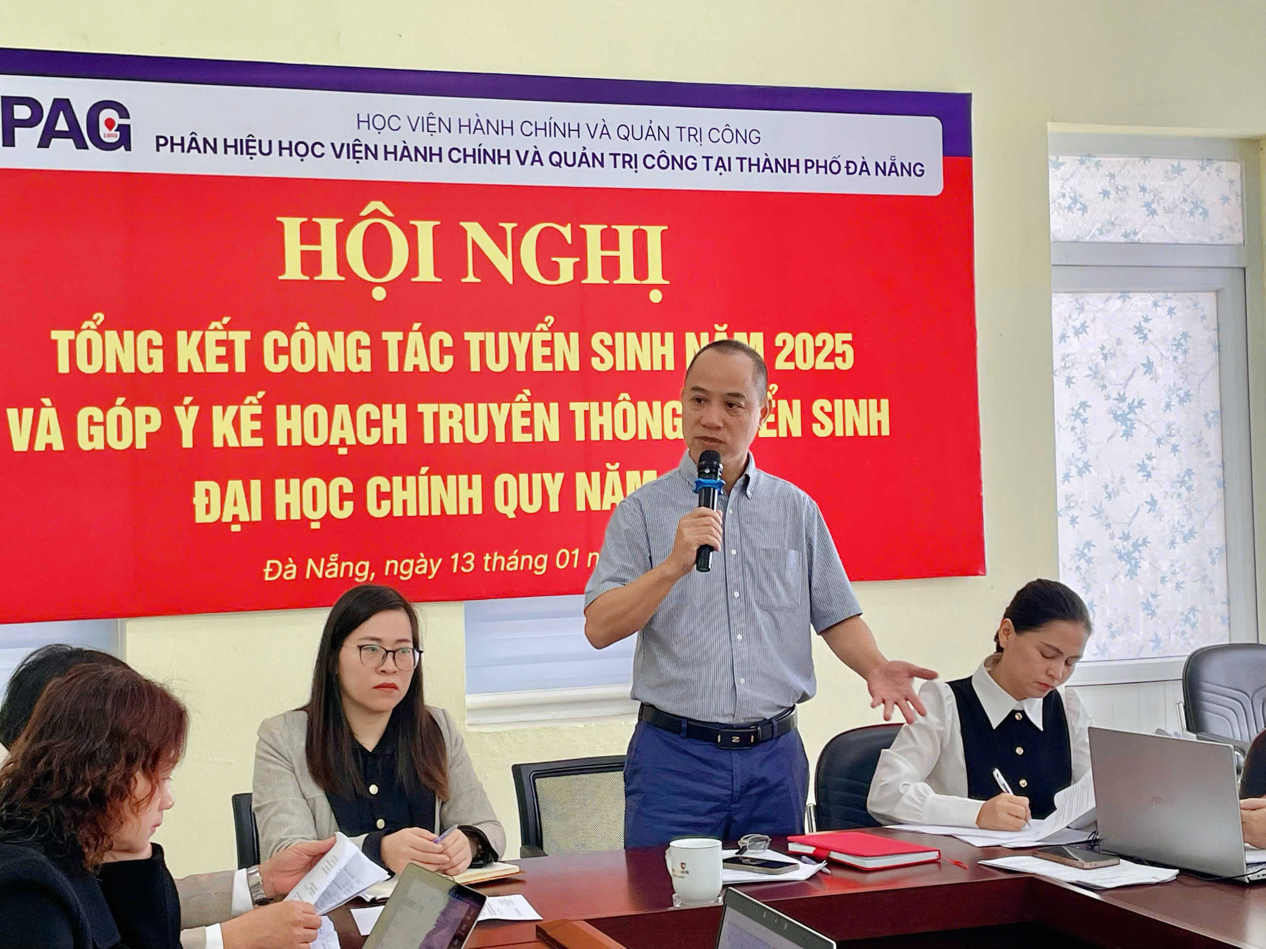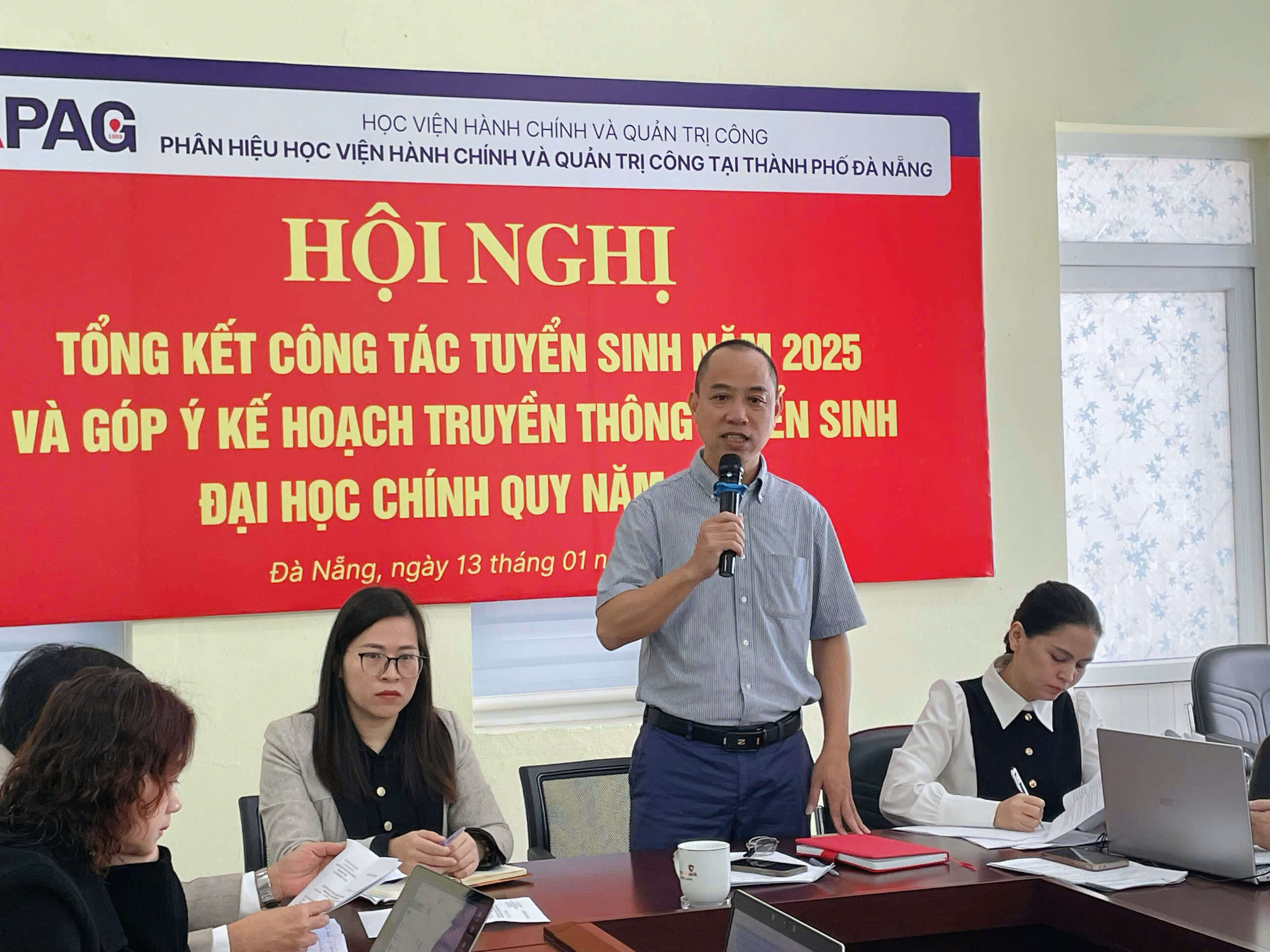 (apag.edu.vn) - Sáng ngày 13/01/2026, tại phòng họp B.201, Phân hiệu Học viện Hành chính và Quản trị công tại thành phố Đà Nẵng đã tổ chức Hội nghị tổng kết công tác tuyển sinh năm 2025 và góp ý kế hoạch truyền thông tuyển sinh đại học chính quy năm 2026.