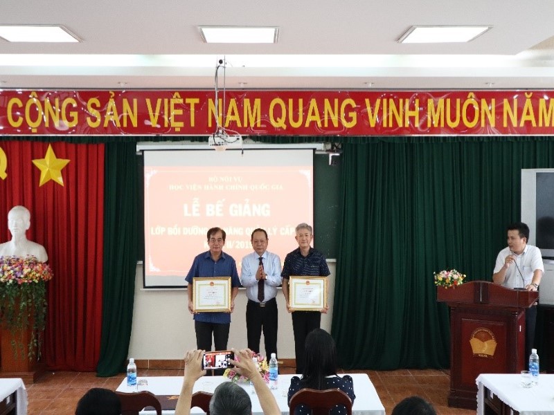 Phát biểu Bế giảng cac khóa học, TS Hà Quang Thanh đánh giá cao sự tham gia của tất cả các Học viên theo học các khóa học này và đã thu được kết quả học tập tích cực. Theo đó, đối với lớp bồi dưỡng năng lực, kỹ năng lãnh đạo quản lý cấp Sở khóa II năm 2019 có 25 Học viên (100%) đã hoàn thành khóa học và đủ điều kiện được cấp chứng chỉ, trong đó có 4 Học viên (16%) đạt loại Giỏi và được Giám đốc Học viện tặng Giấy khen và 21 Học viên (84%) đạt loại Khá; đối với lớp bồi dưỡng năng lực, kỹ năng lãnh đạo quản lý cấp Vụ và tương đương khóa II năm 2019 có 26 Học viên (100%) đã hoàn thành khóa học và đủ điều kiện được cấp chứng chỉ, 100% Học viên đạt loại Khá. Đồng thời, cũng đánh giá cao sự phối hợp của các đơn vị tại Phân viện trong hỗ trợ các điều kiện giúp khóa học hoàn thành nhiệm vụ theo yêu cầu đặt ra. Nhân kết thúc khóa học, TS Hà Quang Thanh cũng đề nghị các Học viện đã tham gia khóa học này đem kiến thức đã tiếp nhận được để vận dụng vào thực tế công việc của mình phù hợp và đạt hiệu quả, đồng thời Phân viện cũng tin tưởng sẽ gặp lại các Học viện ở các lớp bồi dưỡng khác hoặc đào tạo ở cấp cao hơn (Thạc sỹ hoặc Tiến sỹ) do Học viện và Phân viện tổ chức. Thừa ủy quyền của Giám đốc Học viện, TS Hà Quang Thanh đã trao chứng chỉ và Giấy khen cho Học viên các khóa học này.