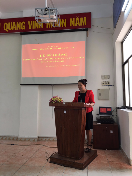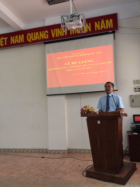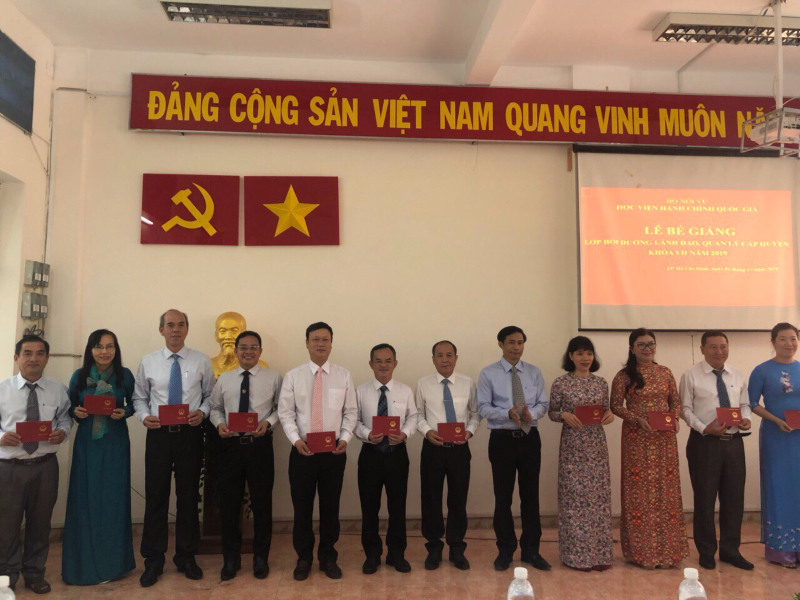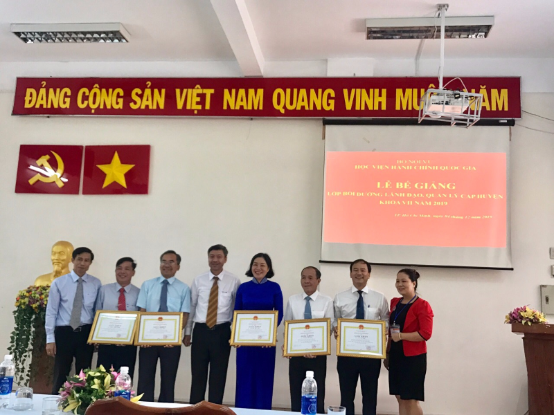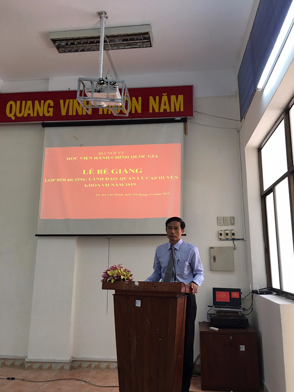 Sau thời gian học tập theo chương trình đã được phê duyệt và căn cứ Quyết định số 4520/QĐ-HCQG ngày 12/11/2019 của Giám đốc Học viện Hành chính Quốc gia, sáng 04/12/2019, thừa ủy quyền của Giám đốc Học viện Hành chính Quốc gia, Phân viện Học viện Hành chính Quốc gia tại TP. Hồ Chí Minh, đã tổ chức Lễ bế giảng Lớp bồi dưỡng lãnh đạo, quản lý cấp Huyện khóa VII năm 2019 với sự tham dự và chủ trì của TS. Nguyễn Thế Tài – Trưởng Phòng Quản lý đào tạo bồi dưỡng Phân viện Học viện tại TP. Hồ Chí Minh, đại diện lãnh đạo một số đơn vị và 75 Học viên tham gia các lớp bồi dưỡng này.