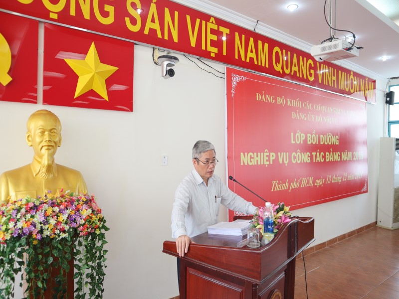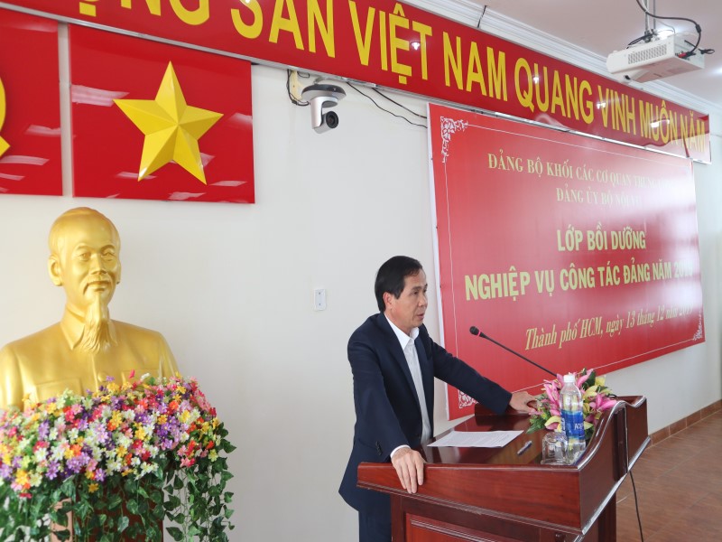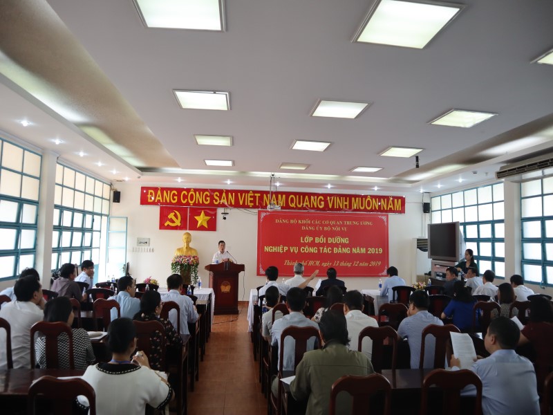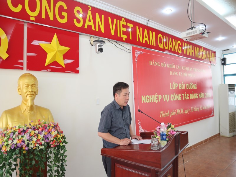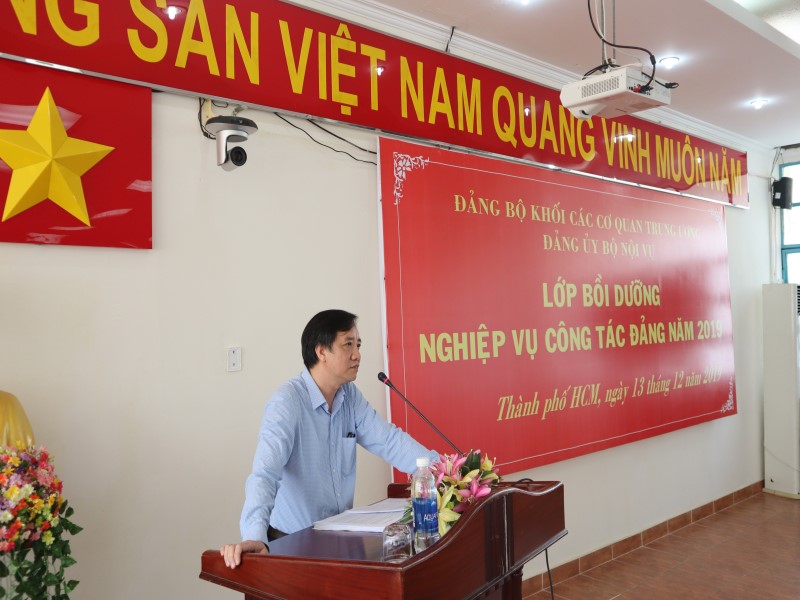 Thực hiện Chỉ thị số 35-CT/TW ngày 30/5/2019 của Bộ Chính trị về Đại hội đảng bộ các cấp tiến tới Đại hội Đại biểu toàn quốc lần thứ XIII của Đảng; Kết luận số 60-KL/TW ngày 08/10/2019 của Bộ Chính trị về độ tuổi tái cử chính quyền và trình độ chuyên môn, lý luận đối với nhân sự tham gia cấp ủy nhiệm kỳ 2020-2025; Hướng dẫn số 26-HD/BTCTW ngày 18/10/2019 của Ban Tổ chức Trung ương về một số nội dung Chỉ thị số 35-CT/TW ngày 30/5/2019 của Bộ Chính trị; Kế hoạch số 155-KH/ĐUK ngày 10/10/2019 của Ban Thường vụ Đảng ủy Khối các cơ quan Trung ương và nhằm nâng cao kiến thức, kỹ năng và cập nhật kịp thời thông tin liên quan đến công tác Đảng, nhất là công tác kiện toàn tổ chức Đảng chuẩn bị cho Đại hội Đảng các cấp tiến tới Đại hội Đảng toàn quốc lần thứ XIII, ngày 13/12/2019, tại Phân viện HVHCQG tại TP. Hồ Chí Minh, Đảng ủy Bộ Nội vụ đã tổ chức Lớp Bồi dưỡng nghiệp vụ công tác Đảng cho các đối tượng là cấp ủy viên và chuyên trách công tác Đảng các tổ chức Đảng thuộc và trực thuộc Bộ Nội vụ đóng trên địa bàn các tỉnh, thành phố phía Nam với sự tham dự của NGƯT.PGS.TS Triệu Văn Cường – Phó Bí thư Đảng ủy, Thứ trưởng Bộ Nội vụ cùng các đồng chí Nguyễn Hữu Tuấn – Ủy viên Ban Thường vụ, Chủ nhiệm UBKT, Nguyễn Ngọc Hưng – Chánh Văn phòng Đảng ủy Bộ Nội vụ, PGS.TS. Huỳnh Văn Thới – Phó Bí thư Đảng ủy Bộ phận, Phó Giám đốc Phân viện HVHCQG tại TP. Hồ Chí Minh và các báo cáo viên đến từ Đảng ủy Khối các Cơ quan Trung ương gồm đồng chí Nguyễn Thành Nam – Ủy viên Ban Thường vụ, Chủ nhiệm UBKT và đồng chí Vũ Đức Nam – Ủy viên Ban Thường vụ, Trưởng Ban Tuyên giáo.
