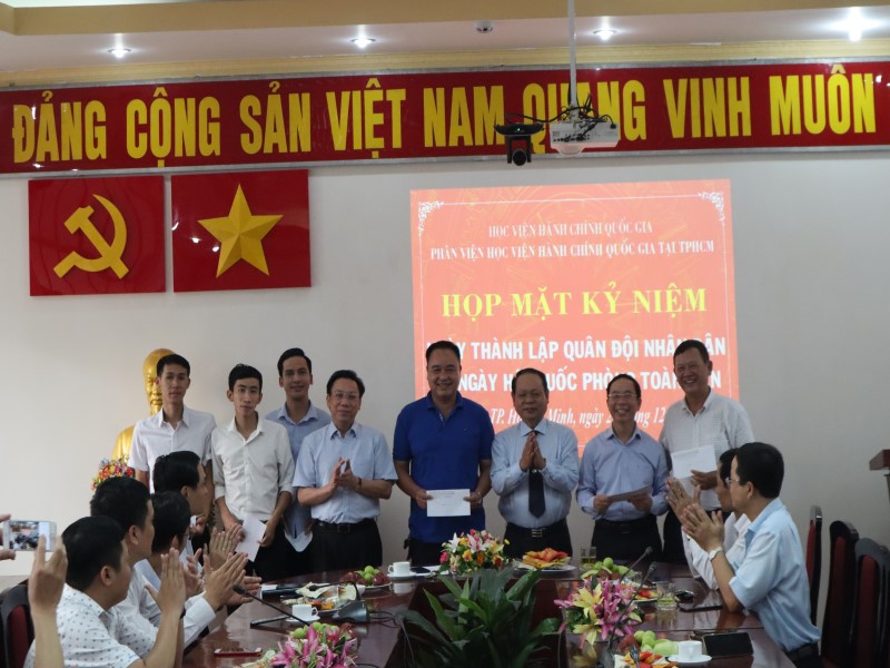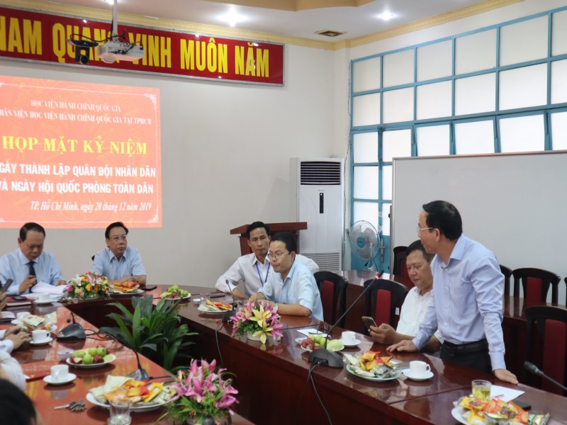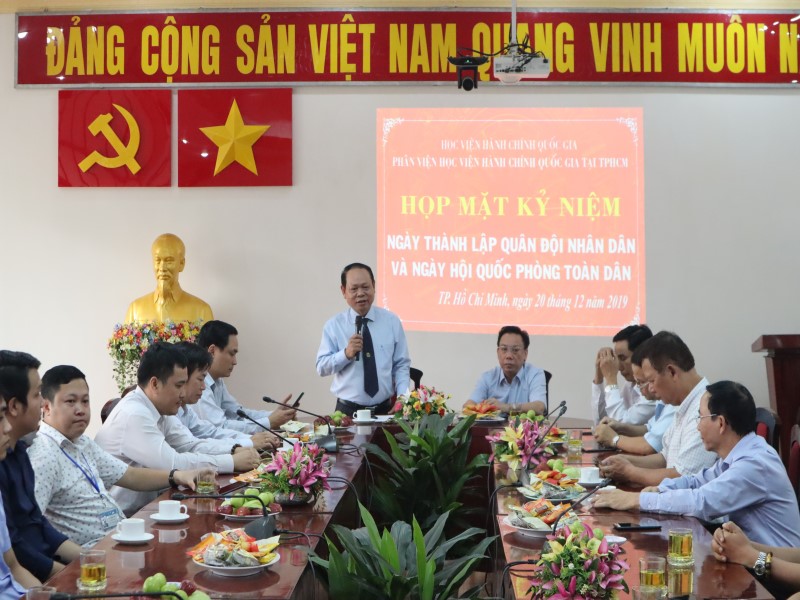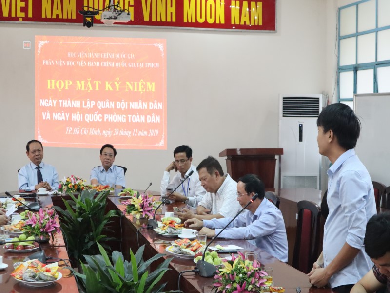 Hòa chung không khí hào hứng, vui tươi và phấn khởi của cả nước, chiều 20/12/2019, Đảng ủy Bộ phận, Ban Giám đốc Phân viện, Công đoàn Bộ phận Phân viện HVHCQG tại TP. Hồ Chí Minh đã tổ chức Họp mặt Kỷ niệm 75 năm (22/12/1944 – 22/12/2018) Ngày thành lập Quân dội Nhân dân Việt Nam và Ngày Hội Quốc phòng toàn dân với sự tham dự của TS. Hà Quang Thanh – UVBTV Đảng ủy Học viện, Bí thư Đảng ủy Bộ phận, Phó Giám đốc Thường trực Phân viện tại TP. Hồ Chí Minh, PGS.TS Huỳnh Văn Thới – Phó Bí thư Đảng ủy Bộ phận Phó Giám đốc Phân viện tại TP. Hồ Chí Minh, TS. Mai Đình Lâm – Đảng ủy viên Đảng ủy Bộ phận, Chủ tịch Công đoàn Bộ phận Phân viện tại TP. Hồ Chí Minh, đại diện lãnh đạo các Phòng, Bộ môn thuộc Phân viện cùng toàn thể các cựu chiến binh là cán bộ, giảng viên, người lao động và sinh viên đang công tác và học tập tại Phân viện tại TP. Hồ Chí Minh.