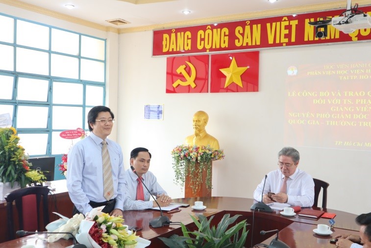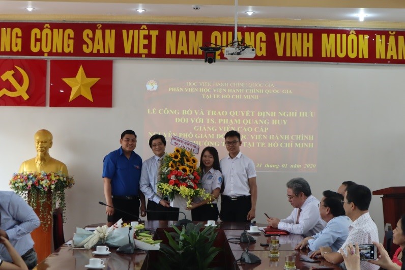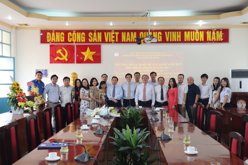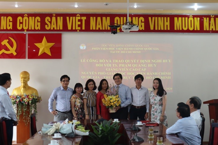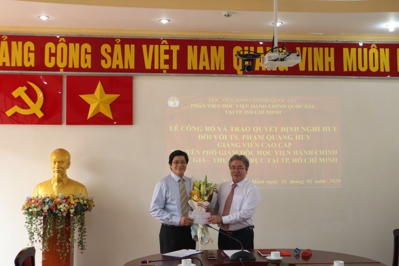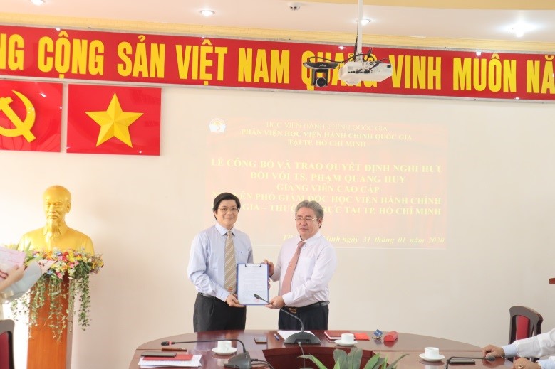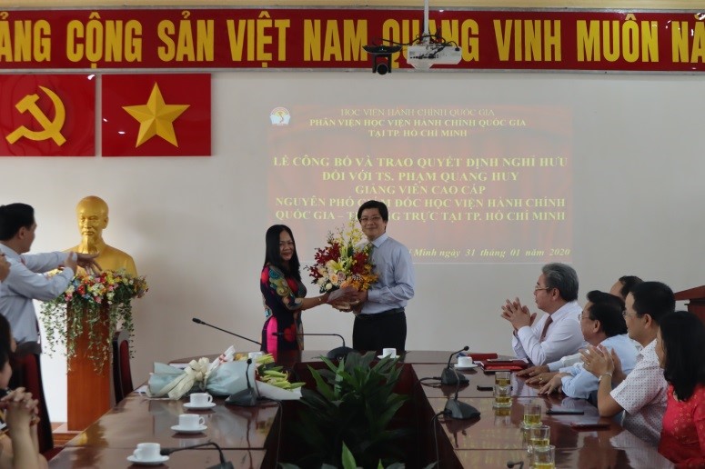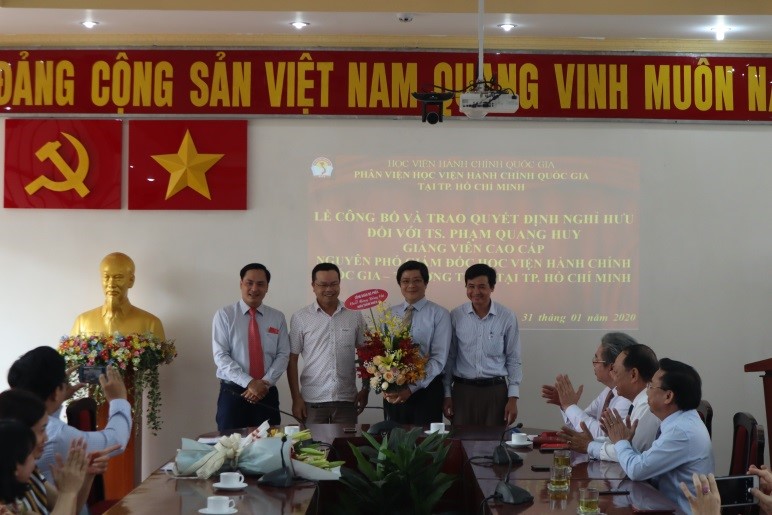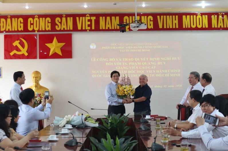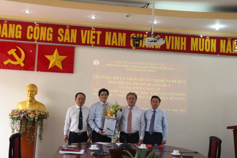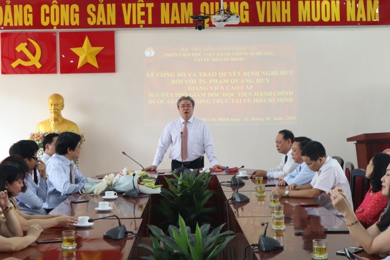 Thực hiện Quyết định số 20/QĐ-HCQG ngày 06/01/2020 của Giám đốc Học viện Hành chính Quốc gia về việc viên chức nghỉ hưu hưởng chế độ bảo hiểm xã hội từ ngày 01/01/2020 đối với TS.GVCC Phạm Quang Huy, sáng 31/01/2020 tại Phân viện Học viện tại TP. Hồ Chí Minh, TS. Đặng Xuân Hoan – Bí thư Đảng ủy, Giám đốc Học viện Hành chính Quốc gia đã chủ trì tổ chức công bố và trao Quyết định nghỉ hưu hưởng chế độ bảo hiểm xã hội cho TS.GVCC Phạm Quang Huy – nguyên Phó Giám đốc Học viện Thường trực tại Cơ sở TP. Hồ Chí Minh với sự tham dự của TS. Hà Quang Thanh – Phó Giám đốc Thường trực Phân viện Học viện tại TP. Hồ Chí Minh, PGS.TS Huỳnh Văn Thới – Phó Giám đốc Thường Phân viện Học viện tại TP. Hồ Chí Minh và lãnh dạo các đơn vị thuộc Phân viện.