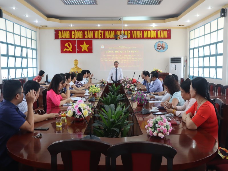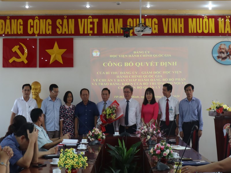 Sáng ngày 21/5/2020, tại Phân viện Học viện Hành chính Quốc gia tại TP. Hồ Chí Minh, đồng chí Đặng Xuân Hoan – Bí thư Đảng ủy, Giám đốc Học viện Hành chính Quốc gia đã chủ trì cuộc họp công bố Quyết định chuẩn y BCH Đảng ủy Đảng bộ Bộ phận Phân viện Học viện Hành chính Quốc gia tại TP. Hồ Chí Minh nhiệm kỳ 2020 – 2025 và Quyết định của Bộ trưởng Bộ Nội vụ tặng cho cán bộ quản lý với sự tham dự của đồng chí Hà Quang Thanh – Phó Giám đốc Thường trực Phân viện Học viện Hành chính Quốc gia tại TP. Hồ Chí Minh, nguyên Bí thư Đảng ủy Bộ phận Phân viện nhiệm kỳ 2015 – 2020, các đồng chí BCH Đảng ủy Đảng bộ Bộ phận Phân viện Học viện Hành chính Quốc gia tại TP. Hồ Chí Minh nhiệm kỳ 2020 – 2025, các đồng chí cấp ủy viên các Chi bộ thuộc Đảng bộ Bộ phận Phân viện và các đồng chí lãnh đạo các đơn vị thuộc Phân viện.