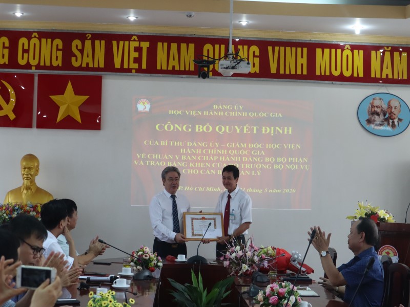 Cũng tại cuộc họp này, thừa ủy quyền của Bộ trưởng Bộ Nội vụ, TS. Đặng Xuân Hoan – Bí thư Đảng ủy, Giám đốc Học viện Hành chính Quốc gia cũng đã công bố Quyết định và trao Băng khen của Bộ trưởng Bộ Nội vụ cho ông Phan Công Khanh – Trưởng phòng Quản trị Phân viện Học viện tại TP. Hồ Chí Minh đã có thành tích trong sáng kiến, cải tiến nâng cao hiệu quả sử dụng cơ sở vật chất phục vụ nhiệm vụ đào tạo và nâng cao nguồn thu cho Phân viện và Học viện.