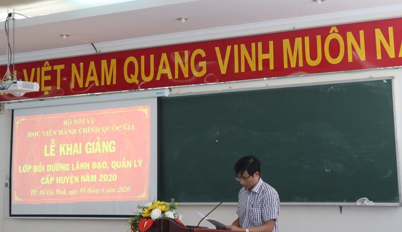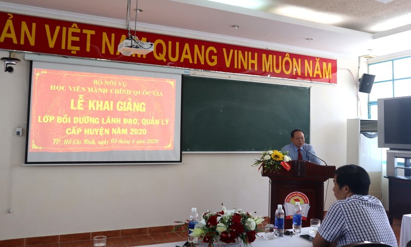 Thực hiện Quyết định của Giám đốc Học viện Hành chính Quốc gia và thừa ủy quyền của Giám đốc Học viện Hành chính Quốc gia, sáng ngày 3/6/2020, Phân viện Học viện Hành chính Quốc gia tại TP. Hồ Chí Minh đã tổ chức Lễ khai giảng Lớp bồi dưỡng lãnh đạo, quản lý cấp Huyện khóa III và IV năm 2020 với sự tham dự của TS. Hà Quang Thanh – Phó Giám đốc Thường trực Phân viện Học viện Hành chính Quốc gia tại TP. Hồ Chí Minh, TS. Nguyễn Thế Tài – Trưởng Phòng Quản lý đào tạo bồi dưỡng, đại diện lãnh đạo một số đơn vị và 80 Học viên tham gia lớp học này.