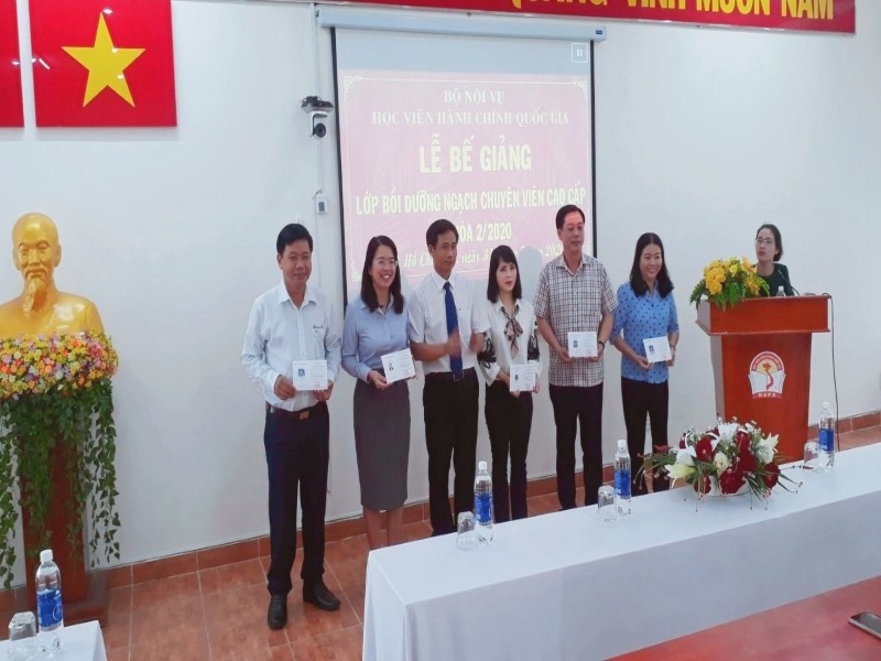Thực hiện Quyết định số 808/QĐ-HCQG ngày 04/05/2020 của Giám đốc Học viện Hành chính Quốc gia và thừa ủy quyền của Giám đốc Học viện Hành chính Quốc gia, sáng ngày 31/7/2020, Phân viện Học viện Hành chính Quốc gia tại Thành phố Hồ Chí Minh đã tổ chức bế giảng Lớp bồi dưỡng ngạch chuyên viên cao cấp khóa II năm 2020 với sự tham dự của TS. Nguyễn Thế Tài – Trưởng Phòng Quản lý Đào tạo và Bồi dưỡng, đại diện lãnh đạo một số đơn vị và các học viên tham gia lớp học.
