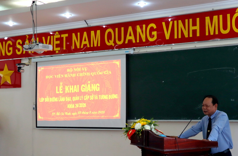 Được sự ủy quyền của Giám đốc Học viện Hành chính Quốc gia, sáng ngày 03/8/2020, Phân viện Học viện Hành chính Quốc gia tại Thành phố Hồ Chí Minh đã tổ chức khai giảng Lớp bồi dưỡng lãnh đạo, quản lý cấp Sở và tương đương khóa 24/2020. Buổi lễ có sự tham dự của TS. Hà Quang Thanh – Phó Giám đốc Thường trực Phân viện Học viện Hành chính Quốc gia tại Thành phố Hồ Chí Minh, TS. Nguyễn Thế Tài – Trưởng Phòng Quản lý Đào tạo và Bồi dưỡng, đại diện lãnh đạo một số đơn vị và các học viên tham gia lớp học.