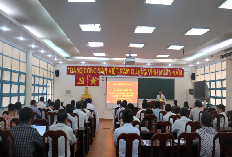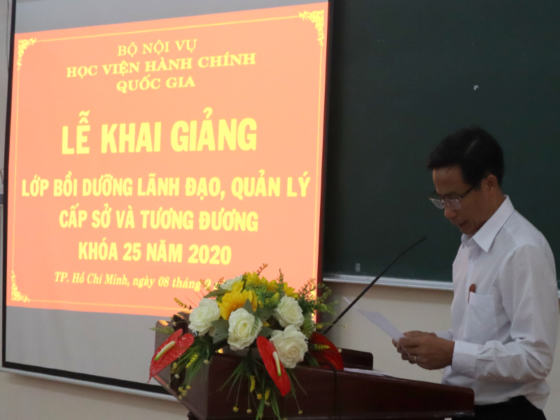 Thực hiện Quyết định số 2750/QĐ-HCQG ngày 07/9/2020 của Giám đốc Học viện Hành chính Quốc gia, được sự ủy quyền của Giám đốc Học viện Hành chính Quốc gia, sáng ngày 08/9/2020 Phân viện Học viện Hành chính Quốc gia tại Thành phố Hồ Chí Minh đã tổ chức khai giảng lớp Bồi dưỡng lãnh đạo, quản lý cấp Sở và tương đương khóa 25/2020. Buổi lễ có sự tham dự của TS. Hà Quang Thanh, Quyền Giám đốc Phân viện Học viện Hành chính Quốc gia tại Thành phố Hồ Chí Minh; TS. Nguyễn Thế Tài, Trưởng Phòng Quản lý Đào tạo và Bồi dưỡng; ThS. Nguyễn Thị Minh Thúy, Phó Trưởng Phòng Quản lý Đào tạo và Bồi dưỡng, đại diện lãnh đạo một số đơn vị và 46 học viên tham gia lớp học.