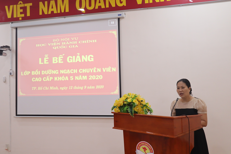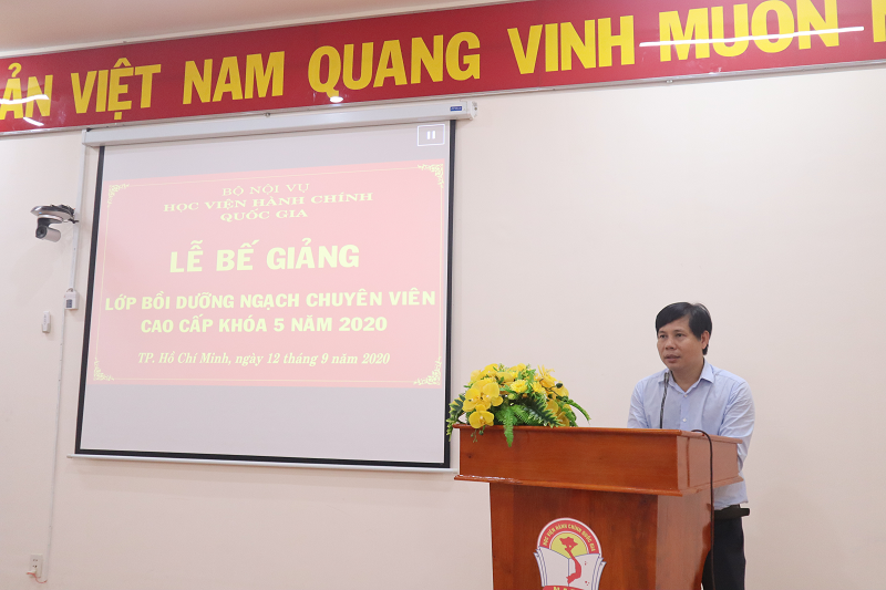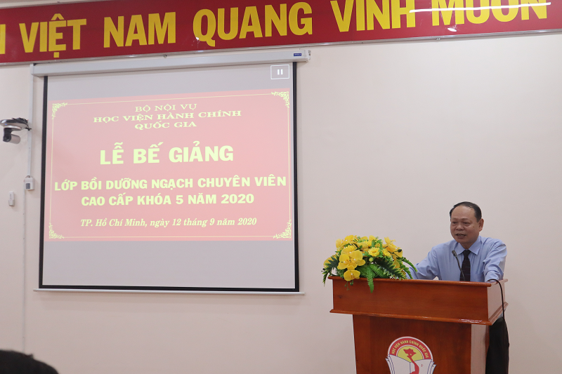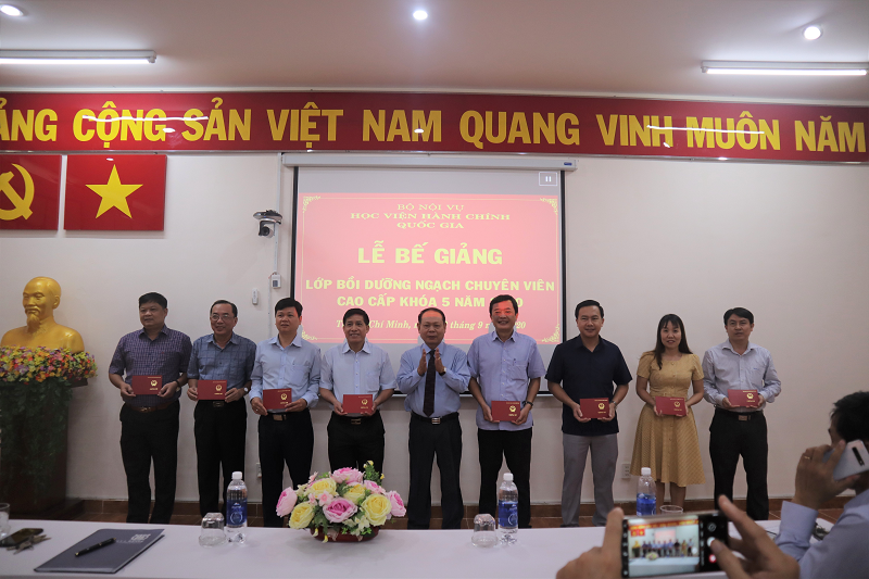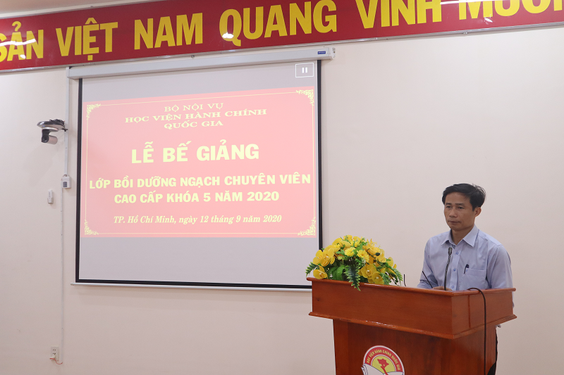 Thừa ủy quyền của Giám đốc Học viện Hành chính Quốc gia, sáng ngày 12/9/2020, Phân viện Học viện Hành chính Quốc gia tại Thành phố Hồ Chí Minh đã tổ chức bế giảng Lớp Bồi dưỡng ngạch chuyên viên cao cấp khóa 5 năm 2020 với sự tham dự của TS. Hà Quang Thanh, Quyền Giám đốc Phân viện Học viện Hành chính Quốc gia tại Thành phố Hồ Chí Minh; TS. Nguyễn Thế Tài, Trưởng Phòng Quản lý Đào tạo và Bồi dưỡng; ThS. Nguyễn Thị Minh Thúy, Phó trưởng Phòng Quản lý đào tạo và Bồi dưỡng; Đại diện lãnh đạo một số đơn vị và các học viên tham gia lớp học.