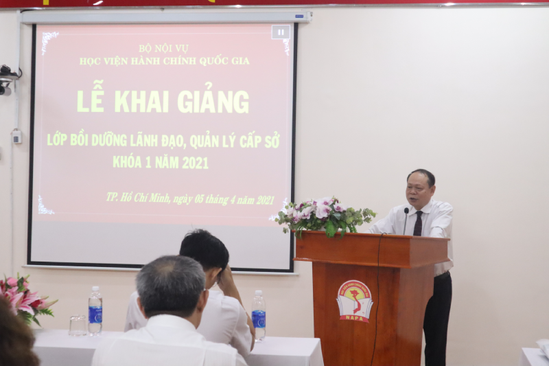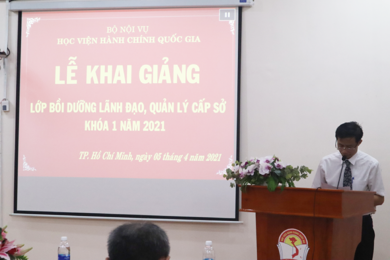 Thực hiện Quyết định 1081/QĐ-HCQG, ngày 02 tháng 4 năm 2021 về việc tổ chức lớp bồi dưỡng lãnh đạo, quản lý cấp Sở và tương đương khóa 1/2021 tại Phân viện Học viện Hành chính Quốc gia tại Thành phố Hồ Chí Minh, sáng ngày 05/4/2021, Phân viện đã long trọng tổ chức Lễ Khai giảng. Dự Lễ Khai giảng có TS. Hà Quang Thanh – Quyền Giám đốc Phân viện Học viện Hành chính Quốc gia tại TP. Hồ Chí Minh, TS. Nguyễn Thế Tài – Trưởng Phòng Quản lý Đào tạo và Bồi dưỡng, ThS. Nguyễn Thị Minh Thúy – Phó trưởng Phòng Quản lý Đào tạo và Bồi dưỡng, một số lãnh đạo Phòng và Bộ môn tại Phân viện, cùng 76 học viên.