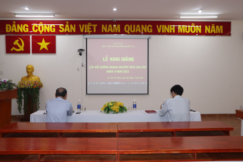 Thực hiện kế hoạch bồi dưỡng, đồng thời chấp hành nghiêm quy định phòng chống dịch COVID-19, vào lúc 8 giờ ngày 06/7/2021, tại phòng 209 – nhà A, Phân viện Học viện Hành chính Quốc gia tại Thành phố Hồ Chí Minh trang trọng tổ chức Lễ khai giảng theo hình thức trực tuyến lớp Bồi dưỡng ngạch chuyên viên cao cấp khóa 9 (lớp A, lớp B) năm 2021.