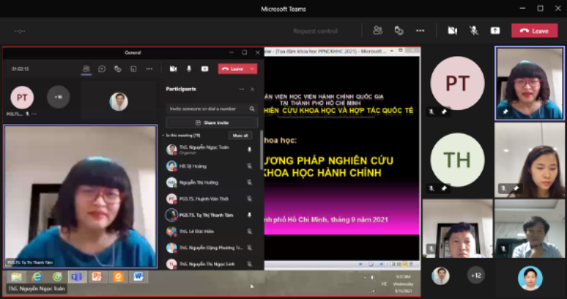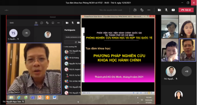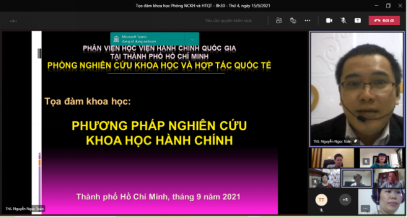 Thực hiện Quyết định số 1097/QĐ-HCQG ngày 05/4/2021 của Giám đốc Học viện Hành chính Quốc gia về việc phê duyệt Danh mục nhiệm vụ khoa học và công nghệ của Học viện Hành chính Quốc gia năm 2021, sáng ngày 15/9/2021, Phòng Nghiên cứu Khoa học và Hợp tác Quốc tế, Phân viện Học viện Hành chính Quốc gia tại Thành phố Hồ Chí Minh đã tổ chức Tọa đàm khoa học “Phương pháp nghiên cứu Khoa học Hành chính”.