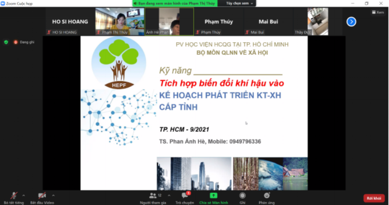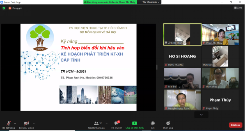 Thực hiện Quyết định số 1097/QĐ-HCQG ngày 05/4/2021 của Giám đốc Học viện Hành chính Quốc gia về việc phê duyệt Danh mục nhiệm vụ khoa học và công nghệ của Học viện Hành chính Quốc gia năm 2021, chiều ngày 20/9/2021, Bộ môn Quản lý nhà nước (QLNN) về Xã hội, Phân viện Học viện Hành chính Quốc gia tại Thành phố Hồ Chí Minh đã tổ chức Tọa đàm khoa học “Kỹ năng tích hợp biến đổi khí hậu vào kế hoạch phát triển kinh tế – xã hội cấp tỉnh” theo hình thức trực tuyến.