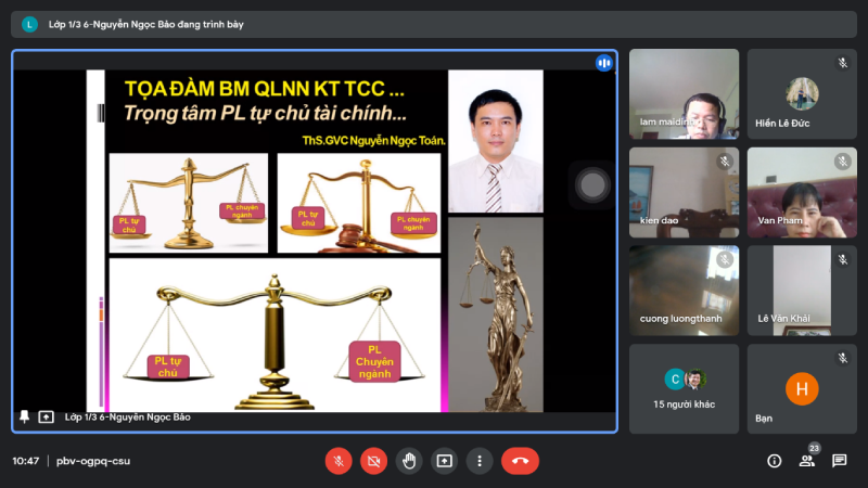 ThS.GVC. Nguyễn Ngọc Toán, Trưởng Phòng Nghiên cứu Khoa học và Hợp tác Quốc tế trình bày tham luận “Trọng tâm pháp luật về tự chủ tài chính cần tuân thủ trong nhà trường đại học”. Tham luận đã làm rõ hạn chế, thiếu sót và nguyên nhân trong thực hiện các quy định pháp luật về tự chủ tài chính trong các trường đại học và nêu ra một số khuyến nghị cụ thể trong thực hiện.