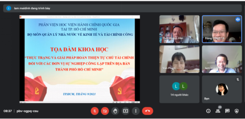 Thực hiện Quyết định số 1097/QĐ-HCQG ngày 05/4/2021 của Giám đốc Học viện Hành chính Quốc gia về việc phê duyệt Danh mục nhiệm vụ khoa học và công nghệ của Học viện Hành chính Quốc gia năm 2021, sáng ngày 24/9/2021, Bộ môn Quản lý nhà nước (QLNN) về Kinh tế và Tài chính công, Phân viện Học viện Hành chính Quốc gia tại Thành phố Hồ Chí Minh đã tổ chức Tọa đàm khoa học “Thực trạng và giải pháp hoàn thiện tự chủ tài chính đối với các đơn vị sự nghiệp công lập trên địa bàn Thành phố Hồ Chí Minh”.