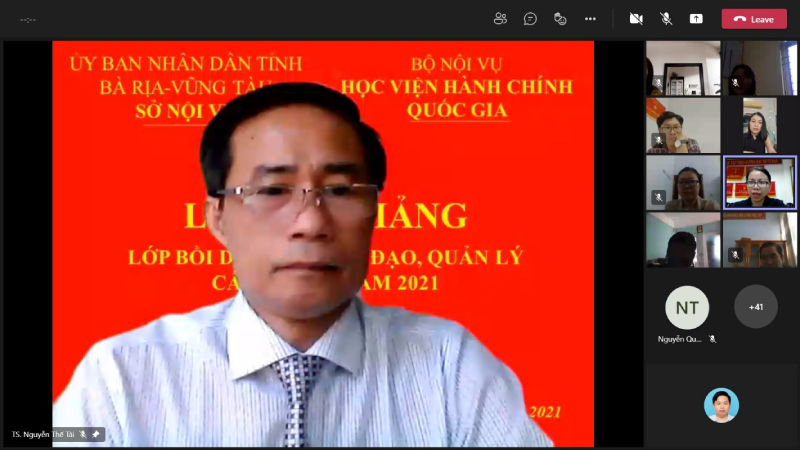 Thực hiện Quyết định số 3175/QĐ-HCQG, ngày 02 tháng 11 năm 2021 về việc tổ chức lớp Bồi dưỡng lãnh đạo, quản lý cấp phòng khóa 2 theo hình thức học trực tuyến tại Sở Nội vụ tỉnh Bà Rịa – Vũng Tàu, sáng ngày 03 tháng 11 năm 2021, Phân viện Học viện Hành chính Quốc gia tại Thành phố Hồ Chí Minh đã long trọng tổ chức Lễ khai giảng theo hình thức trực tuyến. Dự Lễ khai giảng có TS. Nguyễn Thế Tài – Trưởng Phòng Quản lý Đào tạo và Bồi dưỡng, đại diện lãnh đạo các đơn vị thuộc Phân viện cùng 67 học viên.