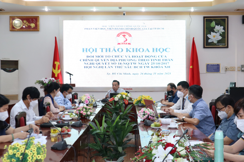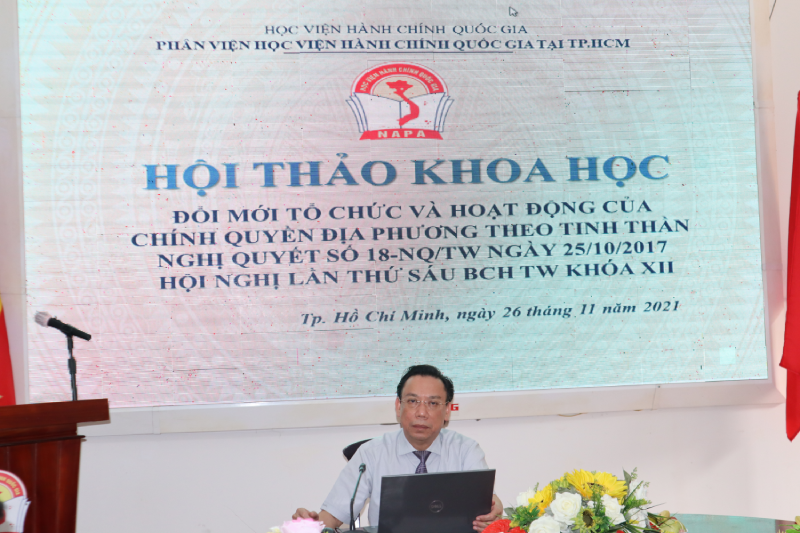 Sáng ngày 26/11/2021, Phân viện Học viện Hành chính Quốc gia tại Thành phố Hồ Chí Minh tổ chức Hội thảo khoa học “Đổi mới tổ chức và hoạt động của chính quyền địa phương theo tinh thần Nghị quyết số 18-NQ/TW ngày 25/10/2017 của Hội nghị lần thứ Sáu Ban chấp hành Trung ương khóa XII” theo hình thức trực tiếp kết hợp trực tuyến.