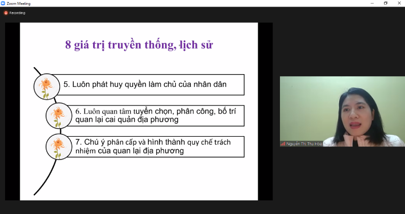 Dưới góc độ nghiên cứu lịch sử, TS. Nguyễn Thị Thu Hoà – Trưởng Bộ môn Khoa học Hành chính và Quản trị, Khoa Chính trị – Hành chính, Đại học Quốc gia Tp. Hồ Chí Minh, trong tham luận “Giá trị truyền thống, lịch sử về chính quyền địa phương ở nước ta”, đã chỉ ra những kinh nghiệm về tổ chức bộ máy và hoạt động của chính quyền địa phương trong lịch sử và nêu lên một số giá trị tham khảo trong xây dựng tổ chức chính quyền địa phương ở nước ta hiện nay.