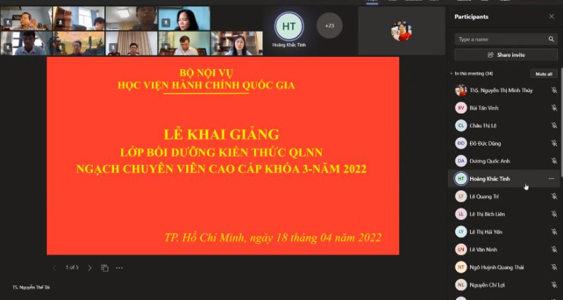 Thực hiện kế hoạch bồi dưỡng, vào lúc 7 giờ 30 phút ngày 18/4/2022, Phân viện Học viện Hành chính Quốc gia tại Thành phố Hồ Chí Minh trang trọng tổ chức Lễ khai giảng theo hình thức trực tuyến lớp Bồi dưỡng ngạch chuyên viên cao cấp khóa 3 năm 2022.