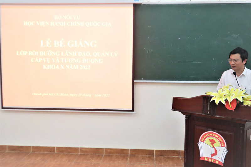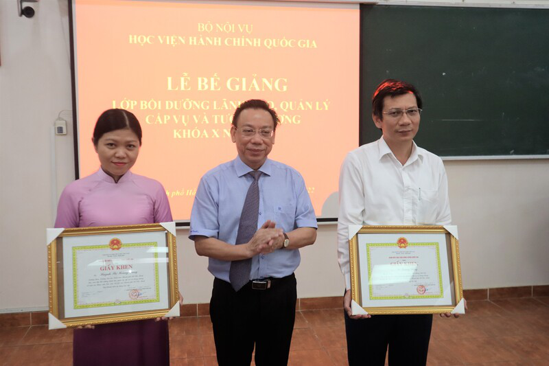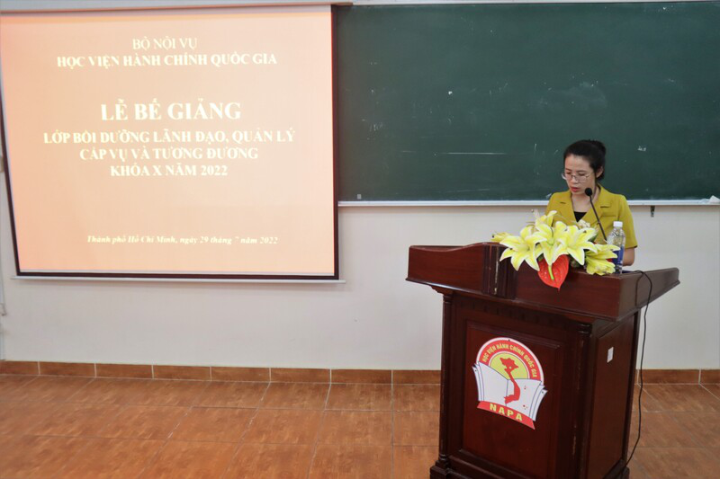 Tại Lễ Bế giảng, TS. Nguyễn Thế Tài, Trưởng phòng, Phòng Quản lý Đào tạo và Bồi dưỡng công bố Quyết định số 2033/QĐ-HCQG ngày 29/6/2022 về việc cấp chứng chỉ cho học viên lớp bồi dưỡng lãnh đạo, quản lý cấp vụ và tương đương khóa 10/2022, tổ chức tại Phân viện Học viện Hành chính Quốc gia tại Thành phố Hồ Chí Minh; Quyết định số 2040/QĐ-HCQG ngày 29/6/2022 về việc khen thưởng cho học viên lớp bồi dưỡng lãnh đạo, quản lý cấp vụ và tương đương khóa 10/2022, tổ chức tại Phân viện Học viện Hành chính Quốc gia tại Thành phố Hồ Chí Minh (số lượng 03 học viên).