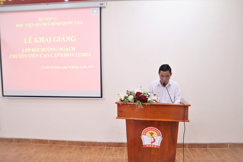 Phát biểu tại Lễ khai giảng, PGS.TS. Huỳnh Văn Thới – Phó Bí thư Đảng ủy Bộ phận, Phó Giám đốc Phụ trách Phân viện Học viện Hành chính Quốc gia tại TP. Hồ Chí Minh hoan nghênh 58 học viên tham gia lớp học, đồng thời khẳng định mục tiêu của khóa bồi dưỡng là cập nhật, nâng cao kiến thức về hành chính nhà nước, các kỹ năng chuyên môn và quản lý phù hợp nhằm nâng cao năng lực thực thi công vụ của đội ngũ chuyên viên cao cấp trong bộ máy nhà nước, đáp ứng yêu cầu đặt ra của cải cách hành chính và hội nhập quốc tế. Phó Giám đốc phụ trách nhấn mạnh đây là Lớp đầu tiên học chương trình mới với trọng tâm là phần kỹ năng, qua đó giúp học viên tăng cường khả năng xử lý các thách thức, tình huống trong quá trình phát triển đất nước và hội nhập quốc tế; trang bị phương pháp tư duy và kỹ năng thực thi công vụ tương ứng với chức trách của chuyên viên cao cấp theo một quy trình khoa học và hiệu quả. Các học viên của Lớp sẽ được nghe giảng và trao đổi với đội ngũ giảng viên của Học viện Hành chính Quốc gia có trình độ chuyên môn cao và kinh nghiệm thực tiễn phong phú. PGS.TS. Huỳnh Văn Thới đề nghị học viên thực hiện nghiêm túc lịch học, kỷ luật lớp học, chủ động nghiên cứu và tham gia thảo luận tích cực các chuyên đề, đồng thời đề nghị các đơn vị và cá nhân liên quan đến việc quản lý lớp học cần phải bám sát tình hình học tập của Lớp, hỗ trợ tối đa cơ sở vật chất và kỹ thuật để kết thúc khóa học với kết quả tốt nhất.