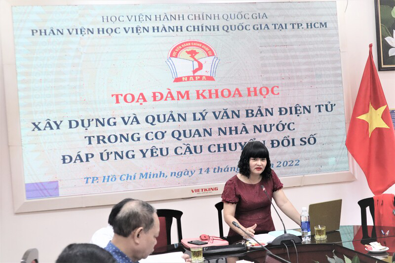Trong phát biểu đề dẫn Tọa đàm, PGS.TS Tạ Thị Thanh Tâm, Trưởng Bộ môn VB và CNHC nhấn mạnh, để làm tốt việc xây dựng và quản lý văn bản điện tử cần làm rõ các vấn đề cơ bản như hiểu biết về văn bản điện tử, giá trị pháp lý của văn bản điện tử; so sánh và nghiên cứu bài học kinh nghiệm của một số quốc gia; nghiên cứu các yêu cầu, khó khăn, thách thức và kiến nghị giải pháp về xây dựng và quản lý văn bản điện tử.