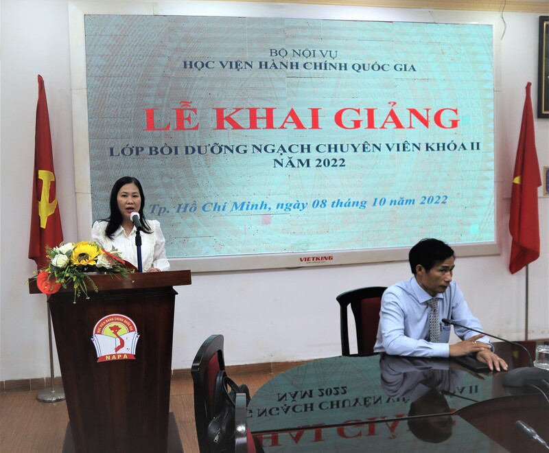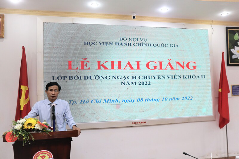 Phát biểu tại Lễ khai giảng, TS. Nguyễn Thế Tài, Trưởng phòng, Phòng Quản lý Đào tạo và Bồi dưỡng hoan nghênh 60 học viên tham gia lớp học, đồng thời khẳng định mục tiêu của khóa bồi dưỡng là trang bị cập nhật kiến thức kỹ năng cần thiết cho học viên trong công tác quản lý nhà nước, tăng cường hiệu quả thực hiện công vụ. TS. Nguyễn Thế Tài nhấn mạnh đây là khóa bồi dưỡng ngạch chuyên viên theo chương trình mới với nhiều chuyên đề kỹ năng thiết thực được giảng dạy trong chương trình như Kỹ năng thuyết trình trong hoạt động công vụ, Kỹ năng giao tiếp hành chính… TS. Nguyễn Thế Tài đề nghị học viên thực hiện nghiêm túc lịch học, kỷ luật lớp học, tuân thủ các quy tắc ứng xử trên môi trường mạng, chủ động nghiên cứu và tham gia thảo luận trao đổi tích cực với giảng viên các nội dung chuyên đề, đồng thời đề nghị các đơn vị và cá nhân liên quan đến việc quản lý lớp học cần phải theo sát tình hình học tập của Lớp, hỗ trợ tối đa cơ sở vật chất và kỹ thuật đặc biệt đảm bảo việc kết nối trực tuyến của học viên và giảng viên trong quá trình học tập để kết thúc khóa học với kết quả tốt nhất.