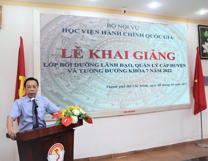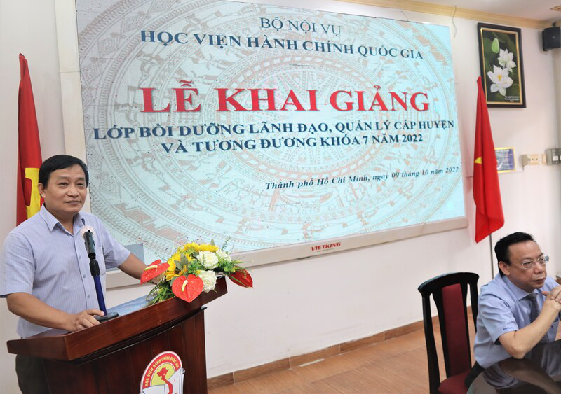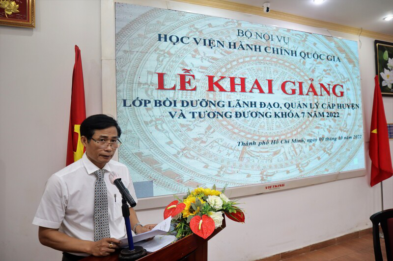 Phát biểu tại Lễ khai giảng, PGS.TS. Huỳnh Văn Thới, Phó Giám đốc Phụ trách Phân viện Học viện Hành chính Quốc gia tại TP. Hồ Chí Minh hoan nghênh 57 học viên tham gia lớp học, đồng thời khẳng định mục tiêu của khóa bồi dưỡng là cập nhật, nâng cao kiến thức về hành chính nhà nước, các kỹ năng chuyên môn và quản lý phù hợp nhằm nâng cao năng lực thực thi công vụ của đội ngũ lãnh đạo quản lý cấp huyện và tương đương, đáp ứng yêu cầu của cải cách hành chính trong bối cảnh hội nhập quốc tế và gắn với tiến trình xây dựng nhà nước pháp quyền. Phó Giám đốc phụ trách nhấn mạnh chương trình bồi dưỡng mới có trọng điểm là phần kỹ năng, qua đó giúp học viên tăng cường khả năng xử lý các thách thức, tình huống trong công việc; trang bị phương pháp tư duy và kỹ năng thực thi công vụ tương ứng theo một quy trình khoa học và hiệu quả. Với mô hình học kết hợp giữa trực tiếp và trực tuyến, PGS.TS. Huỳnh Văn Thới đề nghị học viên thực hiện nghiêm túc lịch học, kỷ luật lớp học, chủ động nghiên cứu và tham gia thảo luận tích cực các chuyên đề với giảng viên, kết hợp nhiều phương pháp giữa nghe giảng lý thuyết với liên hệ với thực tiễn, đồng thời đề nghị các đơn vị và cá nhân liên quan đến việc quản lý lớp học cần phải theo sát tình hình học tập của Lớp, hỗ trợ tối đa cơ sở vật chất và kỹ thuật để kết thúc khóa học với kết quả tốt nhất.