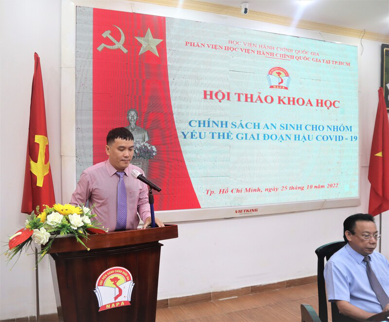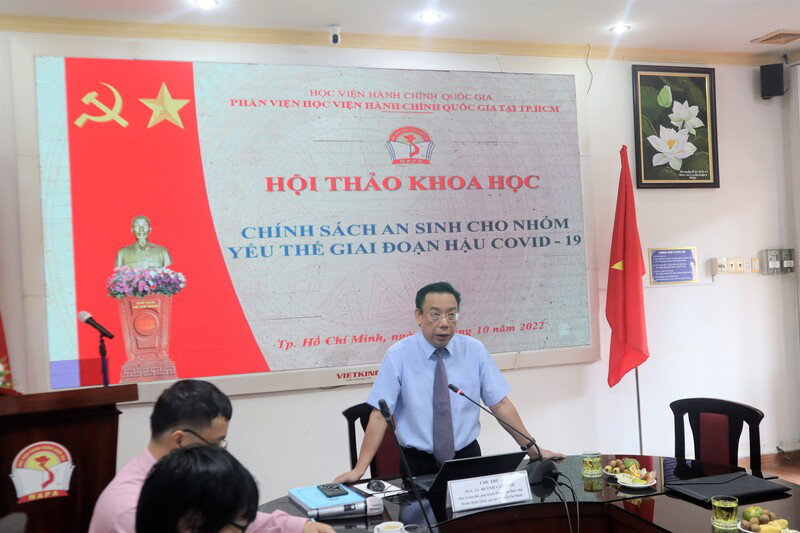Hội thảo đã nhận được 40 tham luận và 11 ý kiến phát biểu, thảo luận trực tiếp tại Hội thảo. Phát biểu đề dẫn Hội thảo, PGS.TS. Huỳnh Văn Thới, Phó Giám đốc phụ trách Phân viện Học viện Hành chính Quốc gia tại TP. Hồ Chí Minh, chủ trì hội thảo, khẳng định nhiều chính sách an sinh xã hội đã được Chính phủ ban hành kịp thời, góp phần làm giảm thiểu khó khăn, hỗ trợ người lao động, nhất là nhóm người yếu thế vượt qua đại dịch, ổn định cuộc sống. Tuy nhiên cơ chế, chính sách chính sách an sinh cho nhóm yếu thế vẫn còn cần nhiều sự hỗ trợ hơn nữa từ Chính phủ và sự vào cuộc của cả hệ thống chính trị để khắc phục hậu quả của đại dịch Covid-19, sớm ổn định đời sống, góp phần phục hồi, phát triển kinh tế – xã hội. Để góp phần cho thành công của Hội thảo, PGS.TS. Huỳnh Văn Thới đề nghị đại biểu tập trung trao đổi, thảo luận các nội dung: nhóm yếu thế trong xã hội và tác động của đại dịch Covid-19 đến nhóm yếu thế; thực trạng thực hiện chính sách an sinh cho nhóm yếu thế trong và sau đại dịch Covid-19 ở Việt Nam; định hướng, nội dung và giải pháp thực hiện chính sách an sinh cho nhóm yếu thế giai đoạn hậu Covid-19.