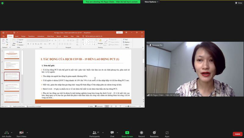 TS. Hồ Ngọc Châm, nghiên cứu viên chính, Viện Xã hội học, Viện Hàn lâm Khoa học xã hội Việt Nam trình bày tham luận “Chính sách trợ giúp lao động phi chính thức trong bối cảnh dịch bệnh Covid-19 trên thế giới và bài học kinh nghiệm cho Việt Nam”. Nội dung tham luận tập trung vào trình bày đặc điểm nhóm lao động thuộc khu vực kinh tế phi chính thức và kinh nghiệm quốc tế trong thực hiện chính sách hỗ trợ cho nhóm lao động phi chính thức rất có giá trị để tham khảo nghiên cứu. Từ đó, TS. Hồ Ngọc Châm đề xuất các nhóm giải pháp hỗ trợ cho các nhóm lao động phi chính thức với sự hỗ trợ của chuyển đổi số, ứng dụng công nghệ thông tin trong thực thi chính sách.