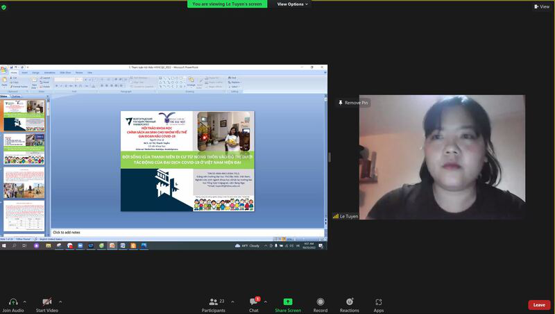 Phát biểu thảo luận tại Hội thảo, ThS. NCS. Lê Thị Thanh Tuyền, Đại học Tổng hợp Volgograd, Liên Bang Nga thông qua kết quả nghiên cứu tác động của dịch Covid-19 đối với nhóm đối tượng thanh niên di cư trong độ tuổi lao động đề nghị cần có những nghiên cứu sâu về tác động tâm lý hậu covid-19 đồng thời có những giải pháp về chăm sóc sức khỏe tinh thần, hỗ trợ tâm lý cho các nhóm yếu thế chịu tác động của đại dịch Covid và giới thiệu một số giải pháp tương ứng như mô hình lớp học cộng đồng, truyền thông online.