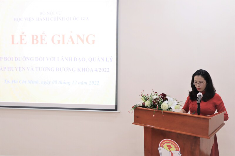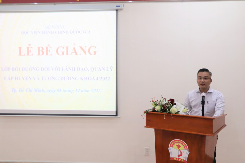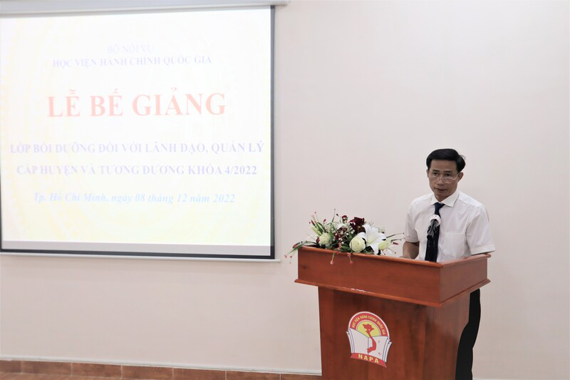 Tại Lễ Bế giảng, TS. Nguyễn Thế Tài, Trưởng phòng, Phòng Quản lý Đào tạo và Bồi dưỡng công bố Quyết định số 4123/QĐ-HCQG ngày 11/11/2022 về việc cấp chứng chỉ cho học viên lớp bồi dưỡng đối với lãnh đạo, quản lý cấp huyện và tương đương khóa 4/2022, tổ chức tại Phân viện Học viện Hành chính Quốc gia tại Thành phố Hồ Chí Minh.