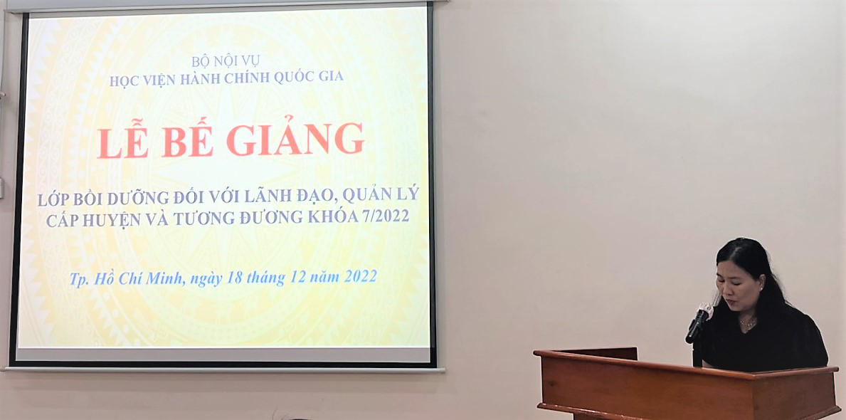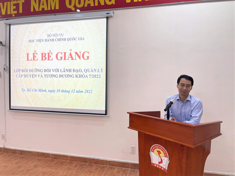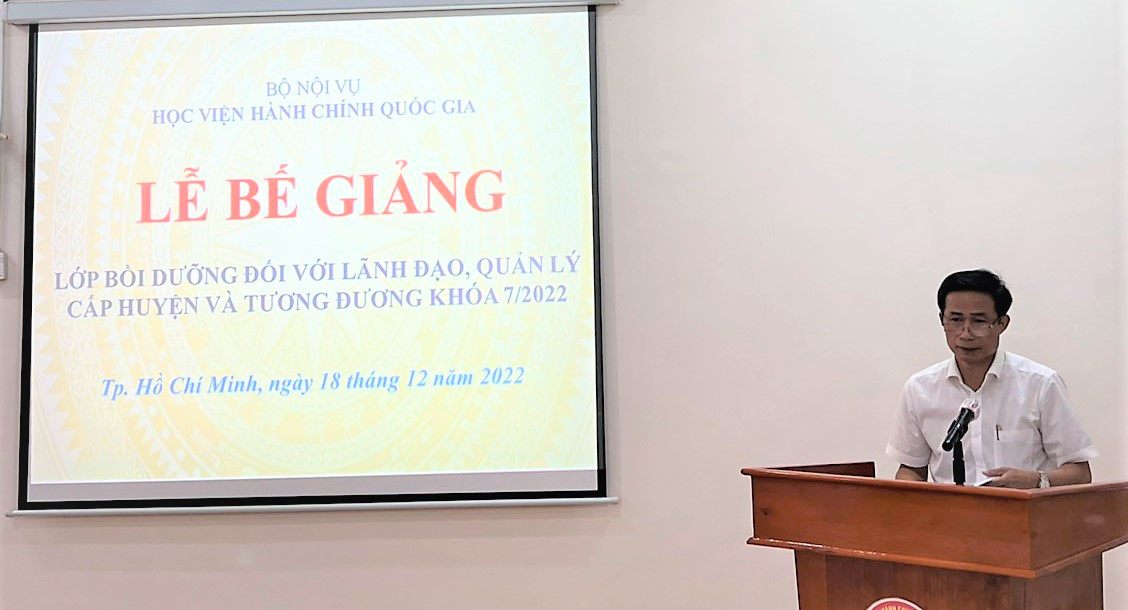 Tại Lễ bế giảng, TS. Nguyễn Thế Tài, Trưởng phòng, Phòng Quản lý Đào tạo và Bồi dưỡng công bố Quyết định số 4256/QĐ-HCQG ngày 24/11/2022 về việc cấp chứng chỉ cho học viên lớp bồi dưỡng đối với lãnh đạo, quản lý cấp huyện và tương đương khóa 7/2022, tổ chức tại Phân viện Học viện Hành chính Quốc gia tại Thành phố Hồ Chí Minh và tại Học viện Hành chính Quốc gia.