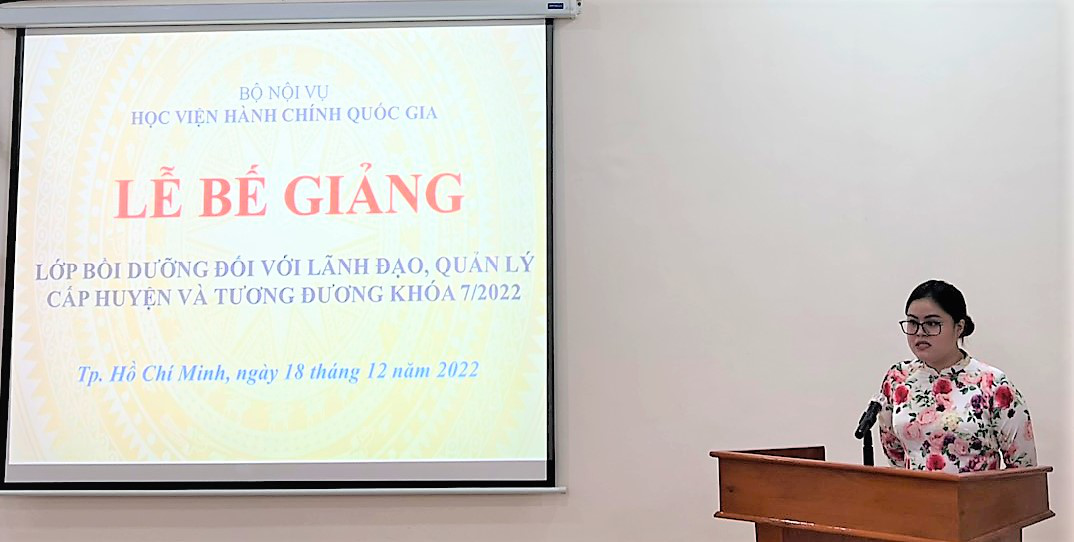 Tại Lễ bế giảng, học viên Lê Thị Lệ Thuỷ, Trưởng Ban tuyên giáo Huyện ủy huyện Tân Hồng tỉnh Đồng Tháp, đại diện học viên bày tỏ sự vui mừng, vinh dự khi tham gia Lớp học; Gửi lời cảm ơn các giảng viên, cán bộ trực tiếp quản lý Lớp, lãnh đạo Học viện Hành chính Quốc gia, lãnh đạo Phân viện tại TP. Hồ Chí Minh, lãnh đạo các đơn vị chủ quản đã tạo điều kiện thuận lợi để các học viên hoàn thành tốt khóa học, đồng thời hứa sẽ thực hiện lời căn dặn của lãnh đạo Phân viện, vận dụng kiến thức đã được học để nâng cao hiệu quả công tác quản lý, điều hành và tham mưu cấp huyện.