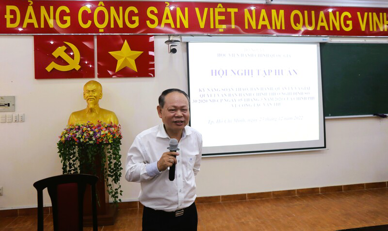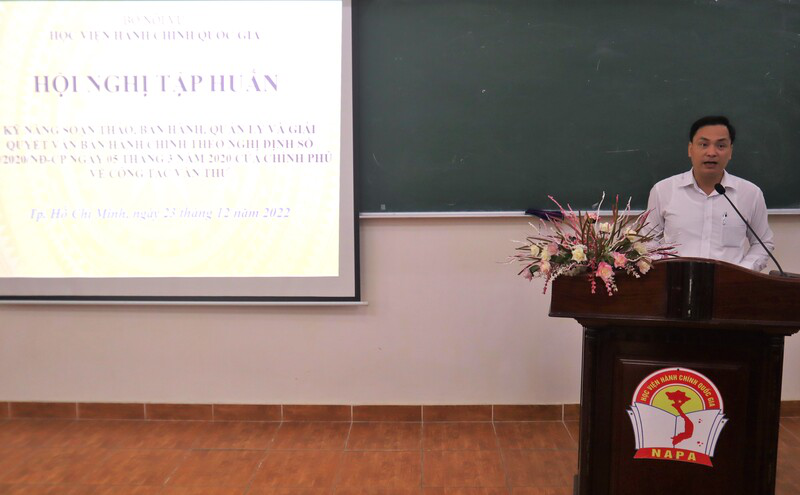Thực hiện Kế hoạch công tác, ngày 23/12/2022, Phân viện Học viện Hành chính Quốc gia tại Thành phố Hồ Chí Minh tổ chức Hội nghị tập huấn Kỹ năng soạn thảo, ban hành, quản lý và giải quyết văn bản hành chính theo Nghị định số 30/2020/NĐ-CP ngày 05 tháng 3 năm 2020 của Chính phủ về công tác văn thư tại phòng 208 nhà A.