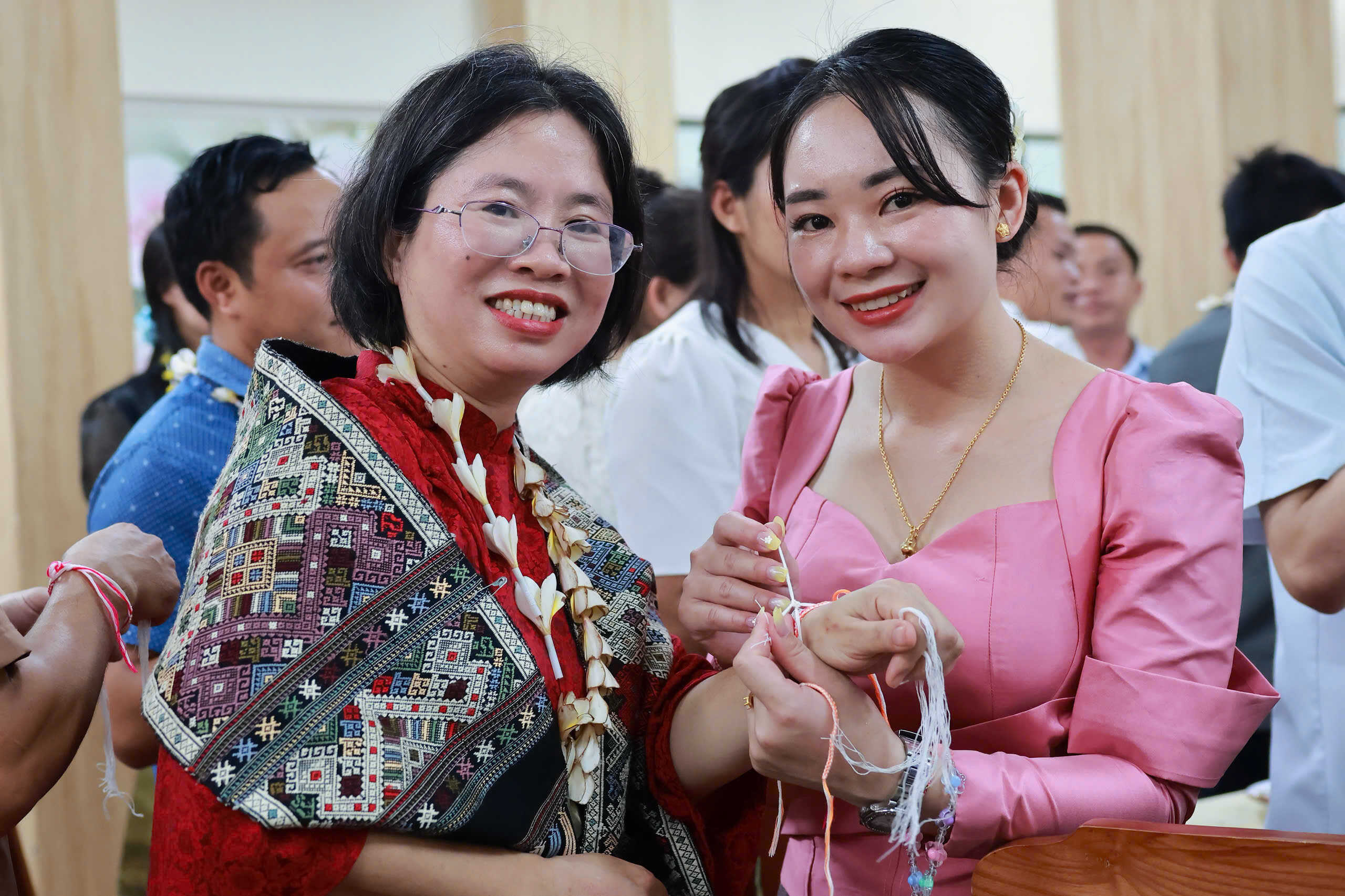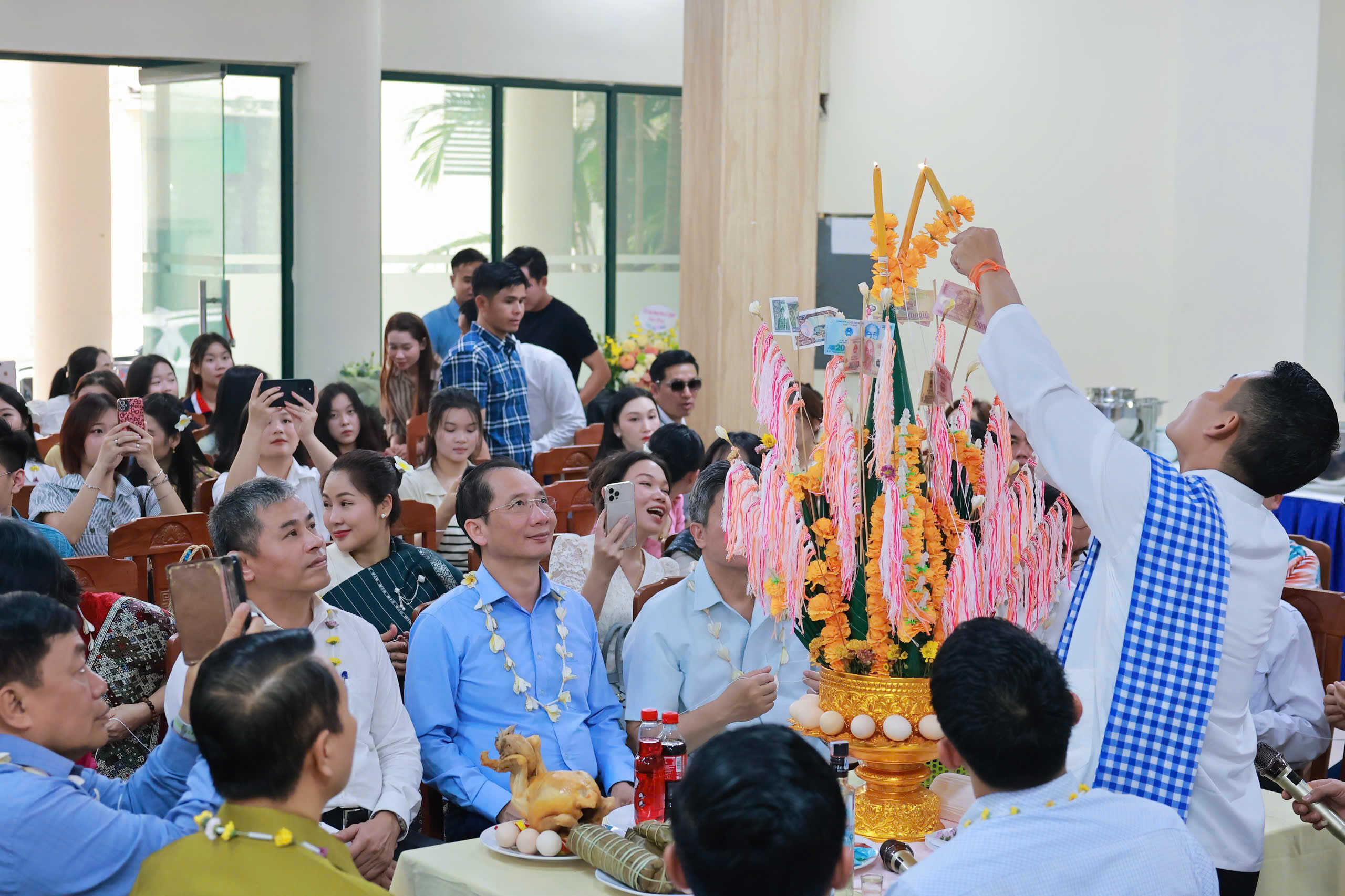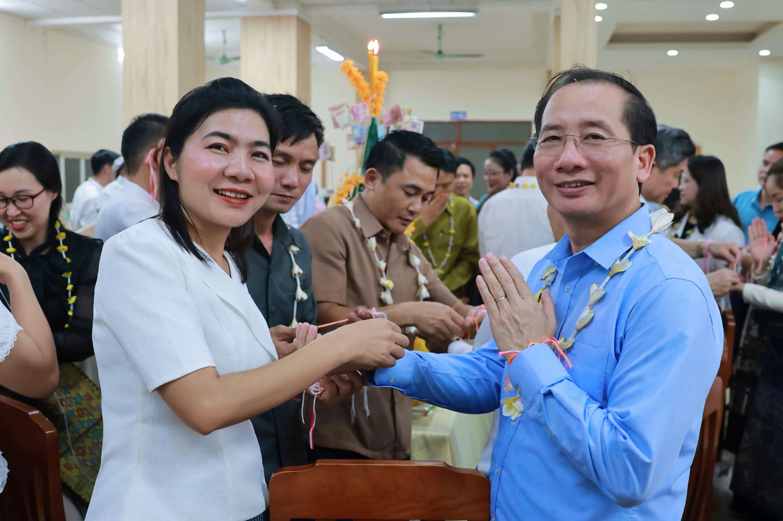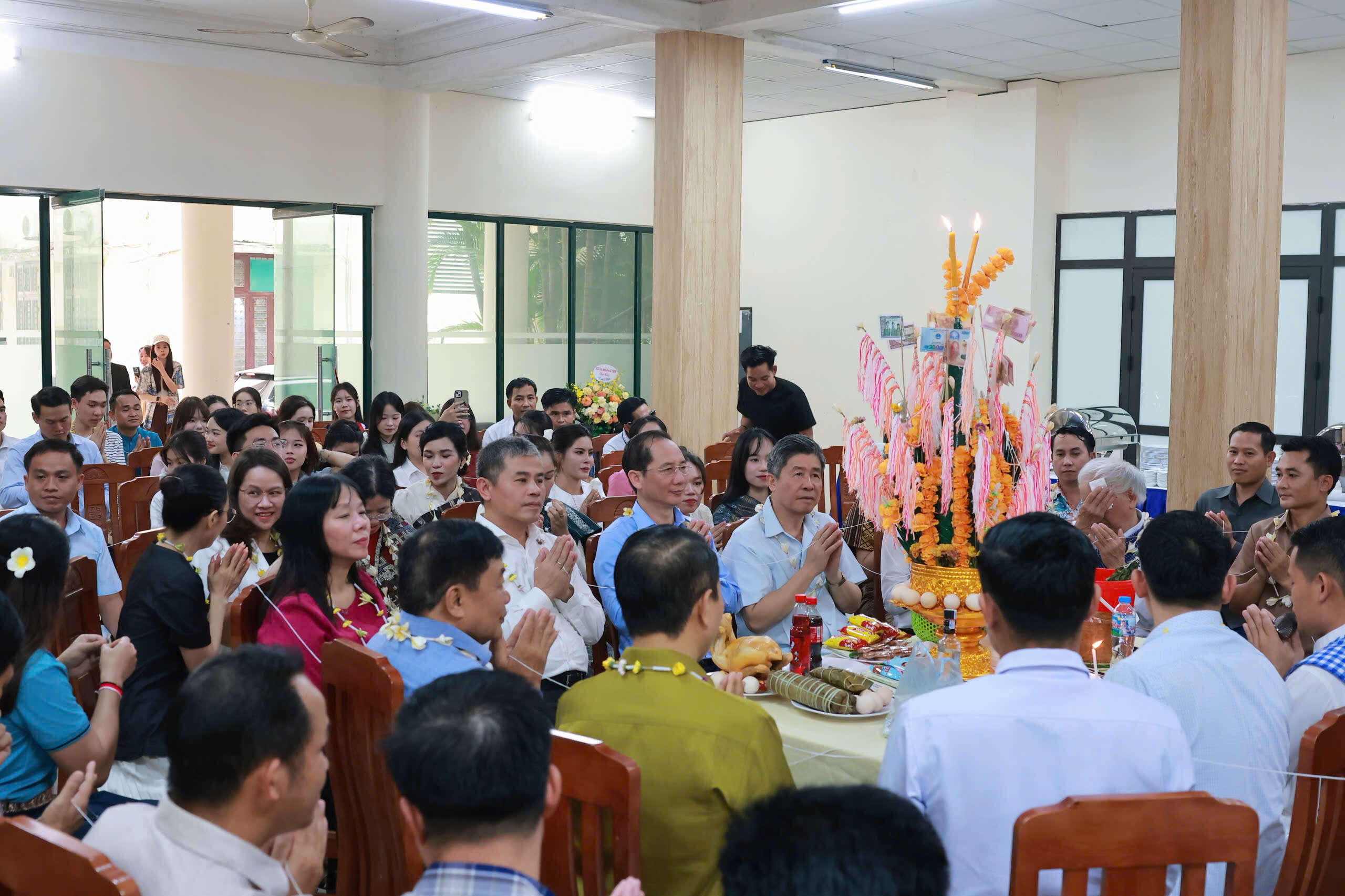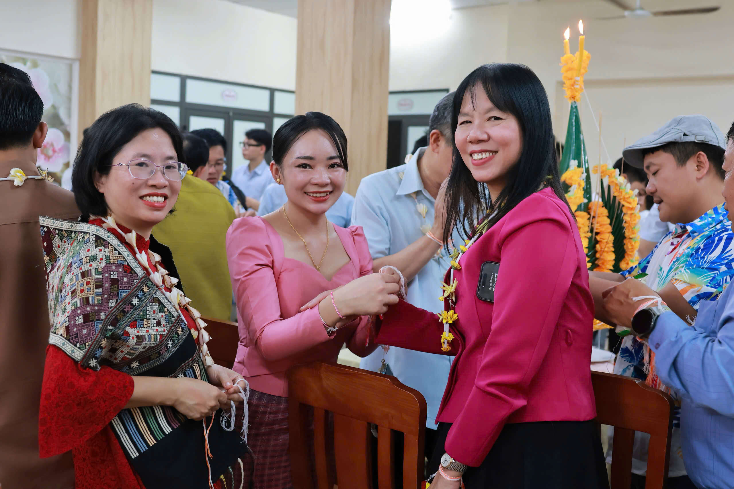 Trong không khí đầm ấm của buổi lễ, lưu học sinh Lào đã biểu diễn những tiết mục văn nghệ chào mừng Tết cổ truyền Bunpimay và chúc mừng tình hữu nghị giữa Đảng, Nhà nước, dân tộc Việt Nam và Lào, cùng với đó là lễ buộc chỉ cổ tay, nghi thức không thể thiếu trong mỗi dịp Tết cổ truyền Bunpimay.