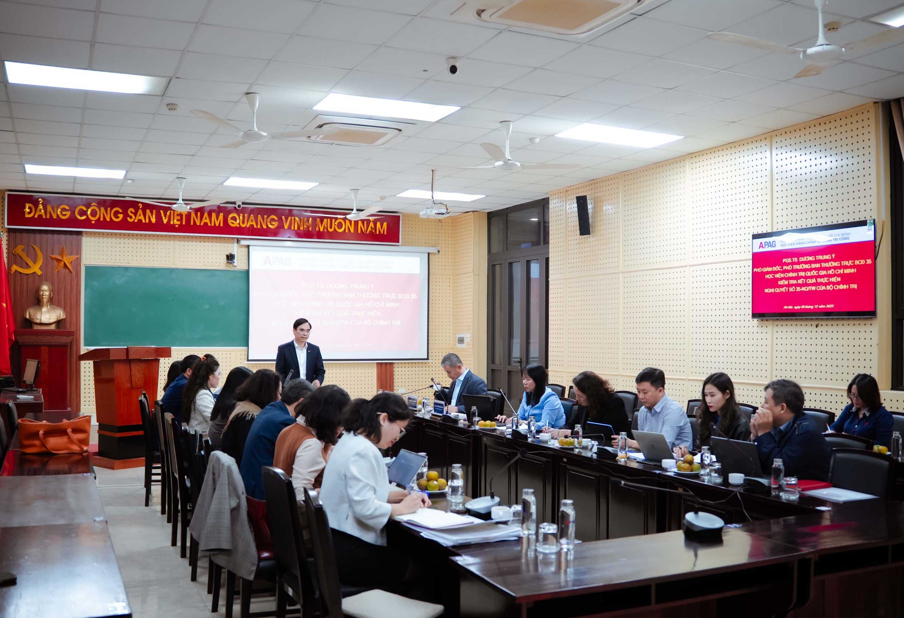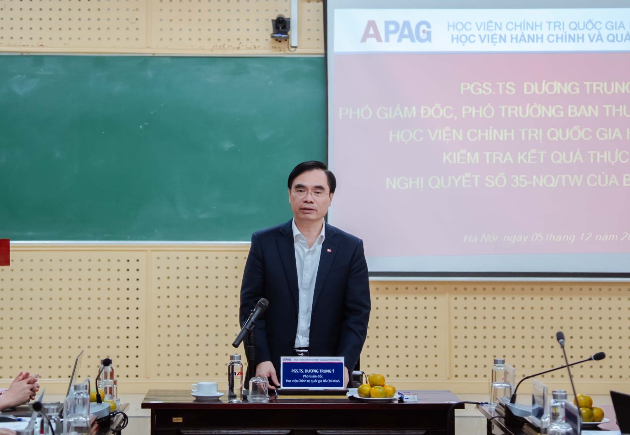 (apag.edu.vn) – Chiều ngày 05/12/2025, tại Hà Nội, Đoàn công tác Ban Chỉ đạo 35 Học viện Chính trị quốc gia Hồ Chí Minh kiểm tra kết quả thực hiện Nghị quyết số 35-NQ/TW ngày 22/10/2018 của Bộ Chính trị (khóa XII) “về tăng cường bảo vệ nền tảng tư tưởng của Đảng, đấu tranh phản bác các quan điểm sai trái, thù địch trong tình hình mới” và Cuộc thi chính luận bảo vệ nền tảng tư tưởng của Đảng lần thứ năm - 2025 tại Học viện Hành chính và Quản trị công. PGS.TS. Dương Trung Ý, Phó Giám đốc Học viện, Phó Trưởng Ban Chỉ đạo 35 Học viện chủ trì Hội nghị.