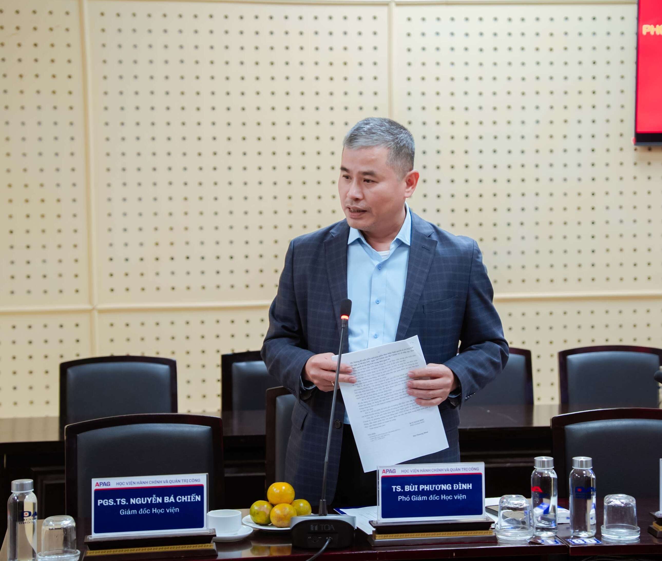 TS. Bùi Phương Đình, Phó Giám đốc Học viện, Phó Trưởng Ban Thường trực Ban Chỉ đạo 35 Học viện Hành chính và Quản trị công báo cáo kết quả