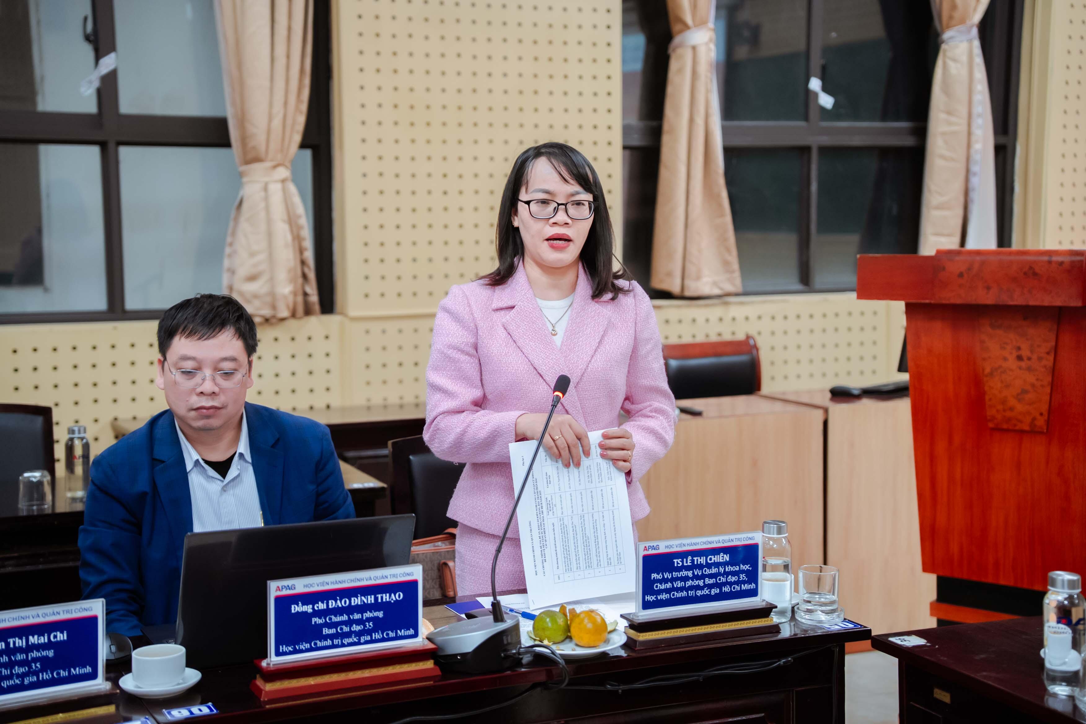 TS. Lê Thị Chiên, Phó Vụ trưởng Vụ quản lý khoa học, Chánh Văn phòng Ban Chỉ đạo 35 Học viện Chính trị quốc gia Hồ Chí Minh phát biểu tại Hội nghị.