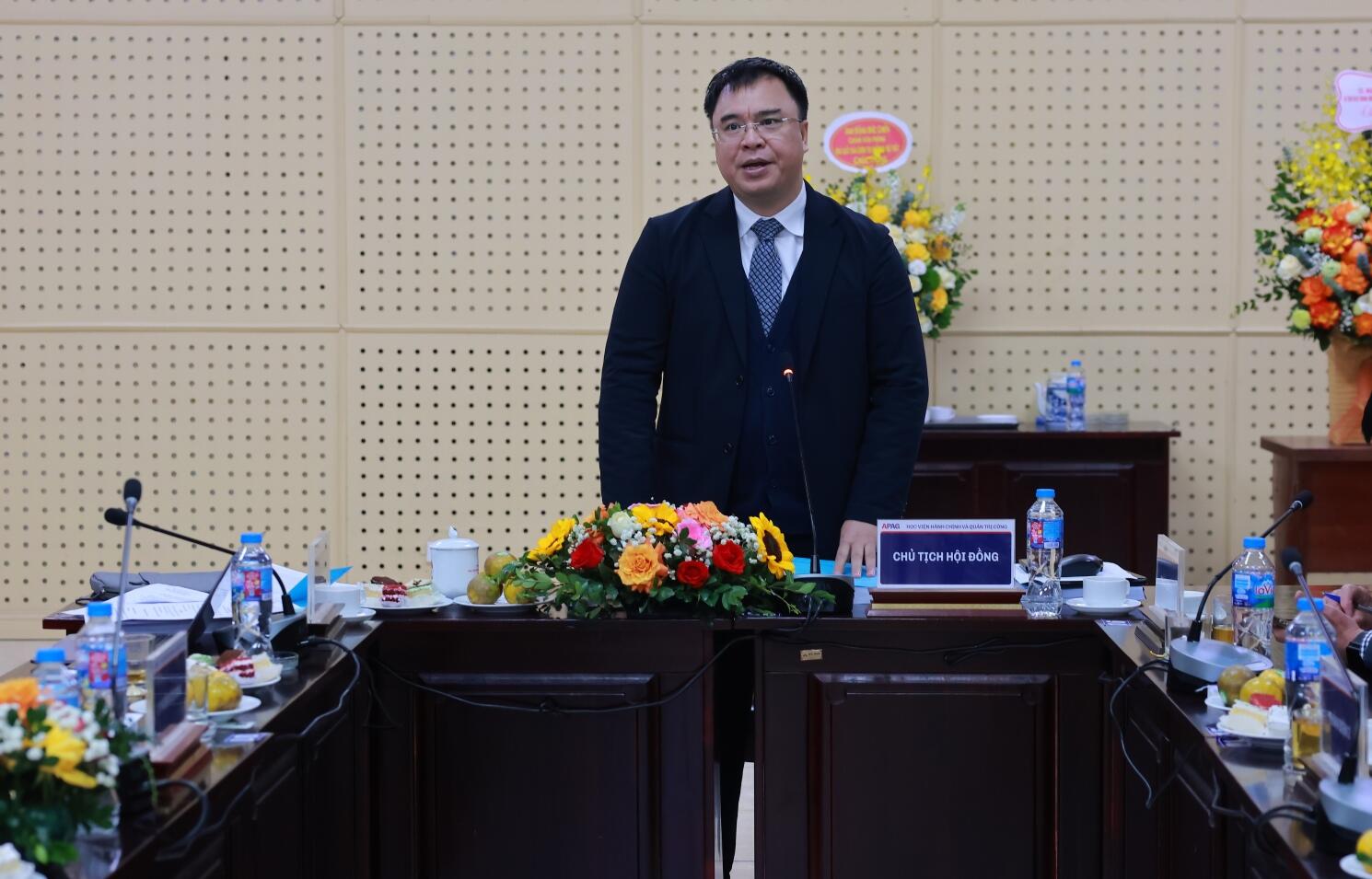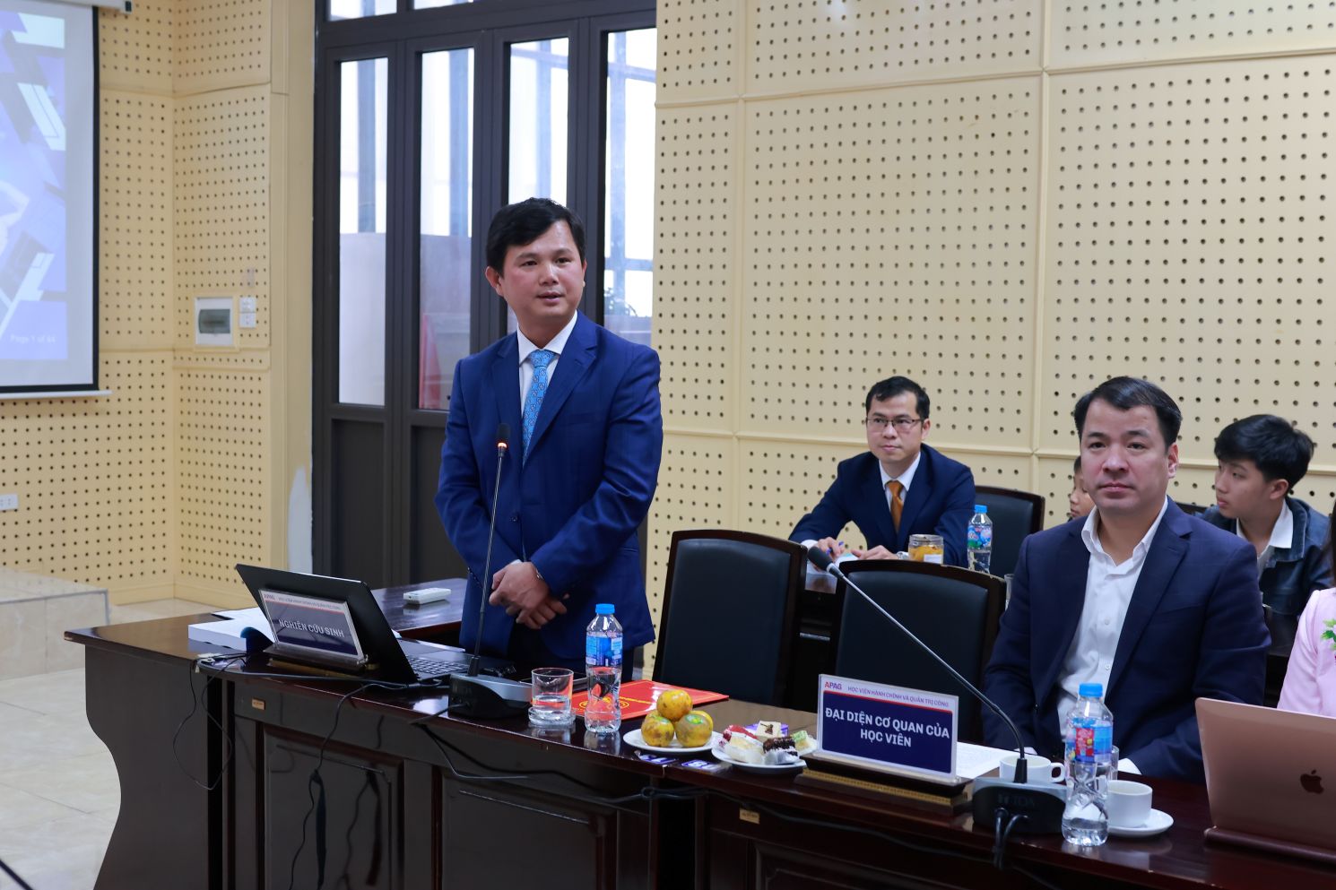 GS.TS. Nguyễn Quốc Sửu, Phó Giám đốc Học viện Hành chính và Quản trị công, Chủ tịch Hội đồng phát biểu tại lễ bảo vệGS.TS. Nguyễn Quốc Sửu, Phó Giám đốc Học viện Hành chính và Quản trị công, Chủ tịch Hội đồng đánh giá luận án tiến sĩ cấp Học viện, chủ trì buổi lễ.