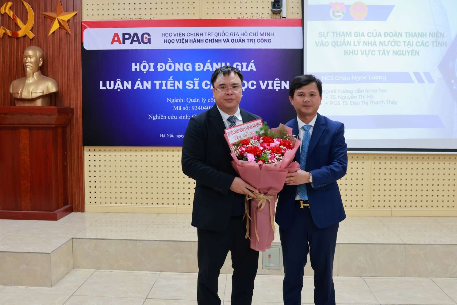 GS.TS. Nguyễn Quốc Sửu, Phó Giám đốc Học viện tặng hoa chúc mừng nghiên cứu sinh Châu Ngọc LươngSự thành công của buổi lễ bảo vệ không chỉ là dấu mốc quan trọng trong sự nghiệp của cá nhân nghiên cứu sinh mà còn góp phần khẳng định chất lượng đào tạo sau đại học của Học viện Hành chính và Quản trị công trong việc cung ứng nguồn nhân lực chất lượng cao, phục vụ sự nghiệp phát triển kinh tế - xã hội của đất nước.