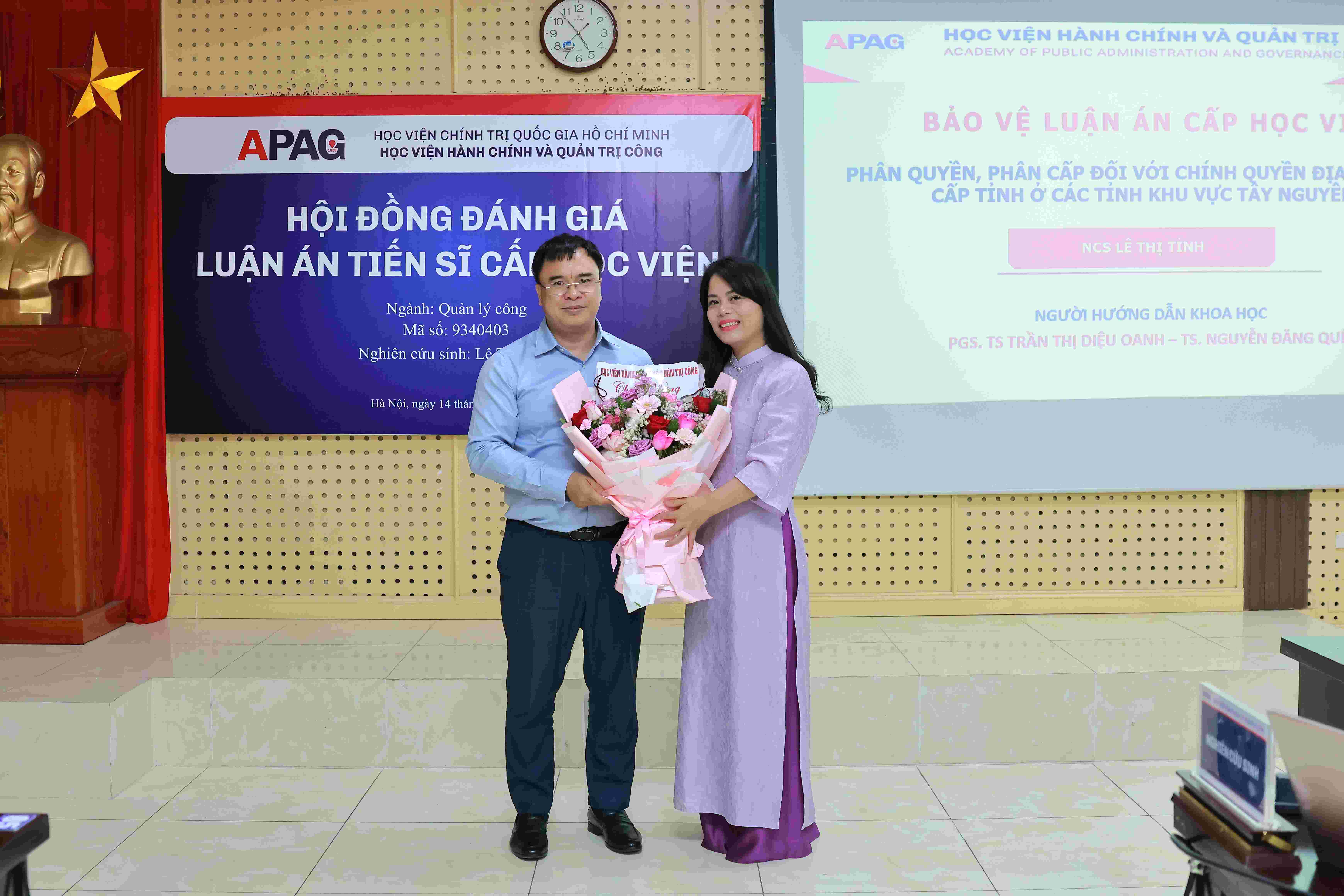 GS.TS. Nguyễn Quốc Sửu - Chủ tịch Hội đồng tặng hoa chúc mừng Nghiên cứu sinh Lê Thị Tình.Kết thúc buổi bảo vệ Luận án tiến sĩ cấp Học viện, Nghiên cứu sinh Lê Thị Tình gửi lời cảm ơn chân thành đến Hội đồng đánh giá về những ý kiến khoa học quý báu; cảm ơn các thầy cô Ban Quản lý đào tạo, Học viện Hành chính và Quản trị công, các thầy cô hướng dẫn và gia đình, bạn bè, đồng nghiệp đã luôn quan tâm, hỗ trợ để Nghiên cứu sinh hoàn thành tốt luận án của mình.