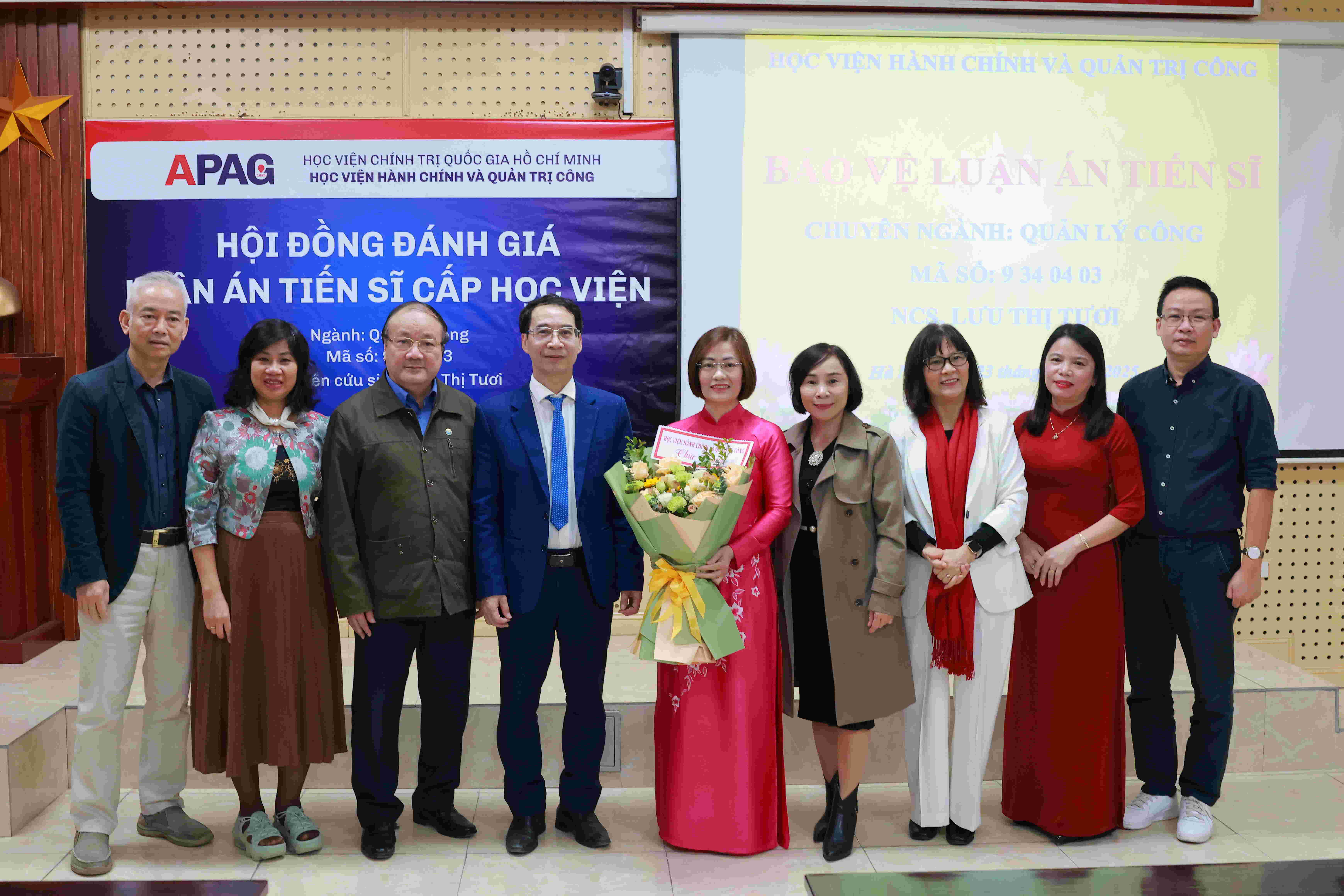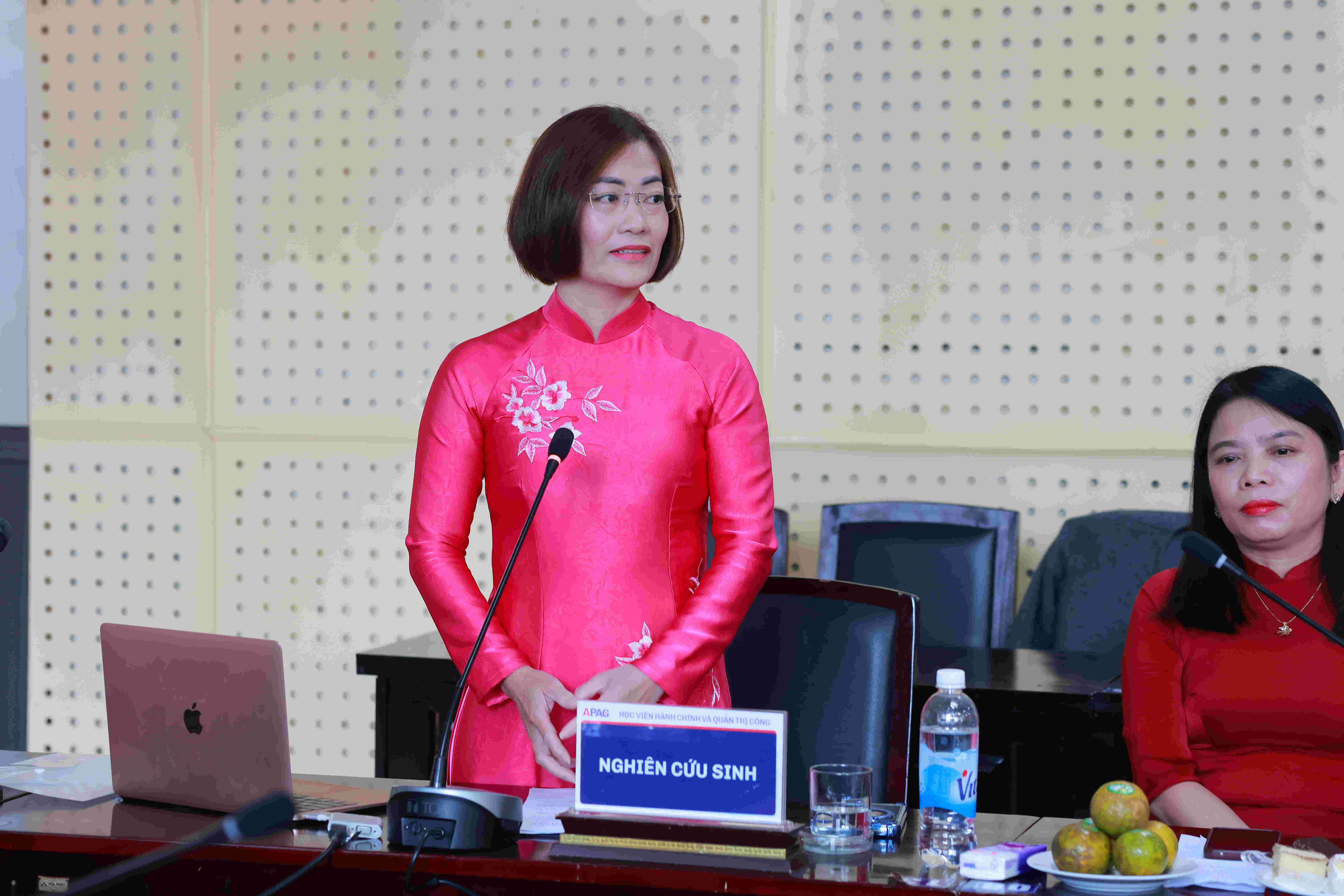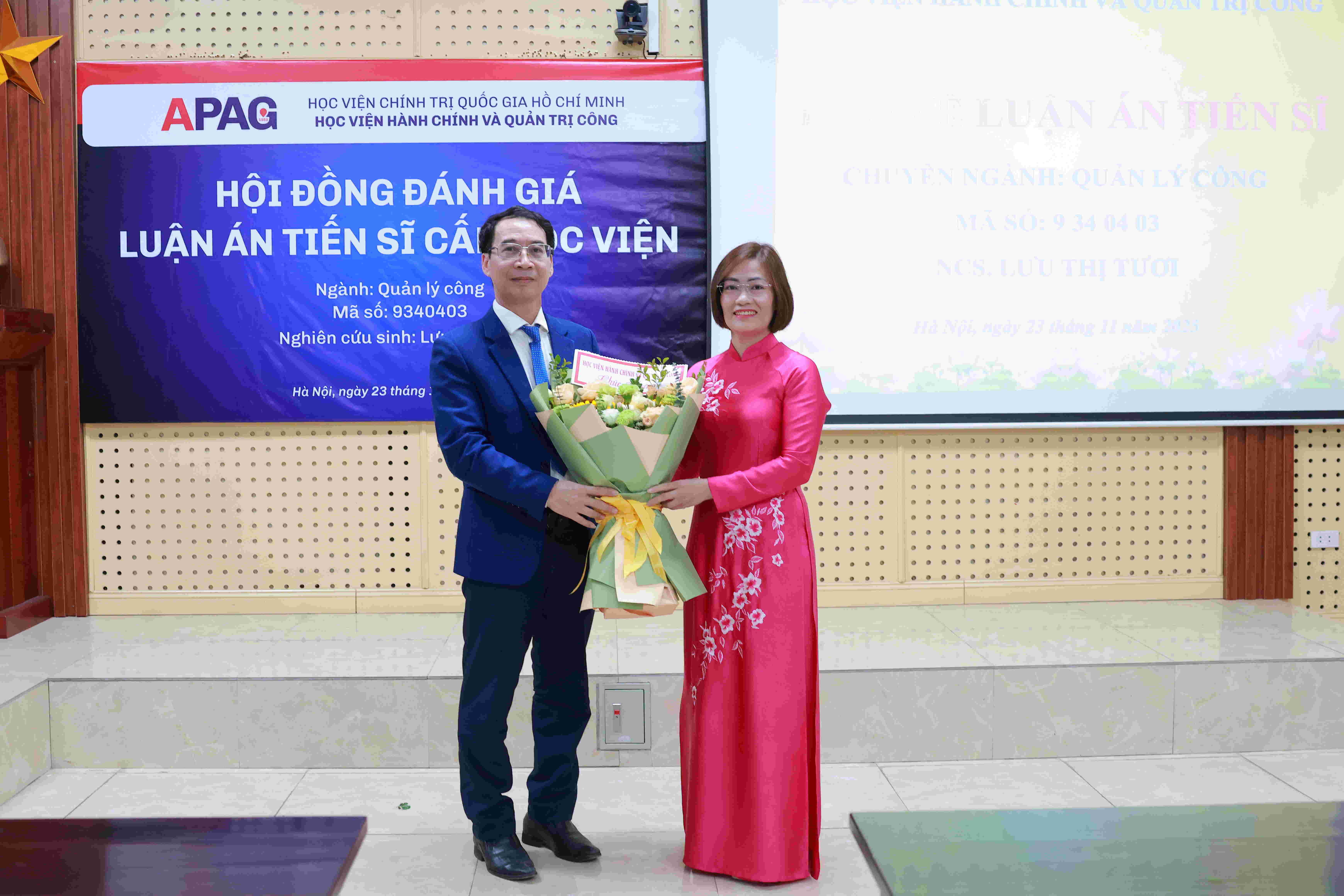 Phát biểu sau buổi bảo vệ, nghiên cứu sinh Lưu Thị Tươi bày tỏ lòng biết ơn sâu sắc tới Hội đồng đánh giá đã dành sự quan tâm, nhận xét và góp ý quý báu để hoàn thiện luận án. Nghiên cứu sinh cũng trân trọng cảm ơn các thầy cô giáo của Học viện Hành chính và Quản trị công, các thầy hướng dẫn cùng gia đình, bạn bè và đồng nghiệp đã luôn ủng hộ, đồng hành và tạo điều kiện thuận lợi trong suốt quá trình học tập và nghiên cứu.