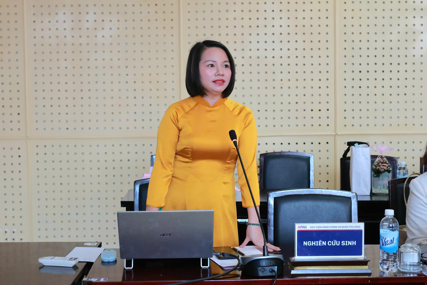 Ảnh: Nghiên cứu sinh Phùng Kim Anh trình bày tóm tắt luận án trước Hội đồng