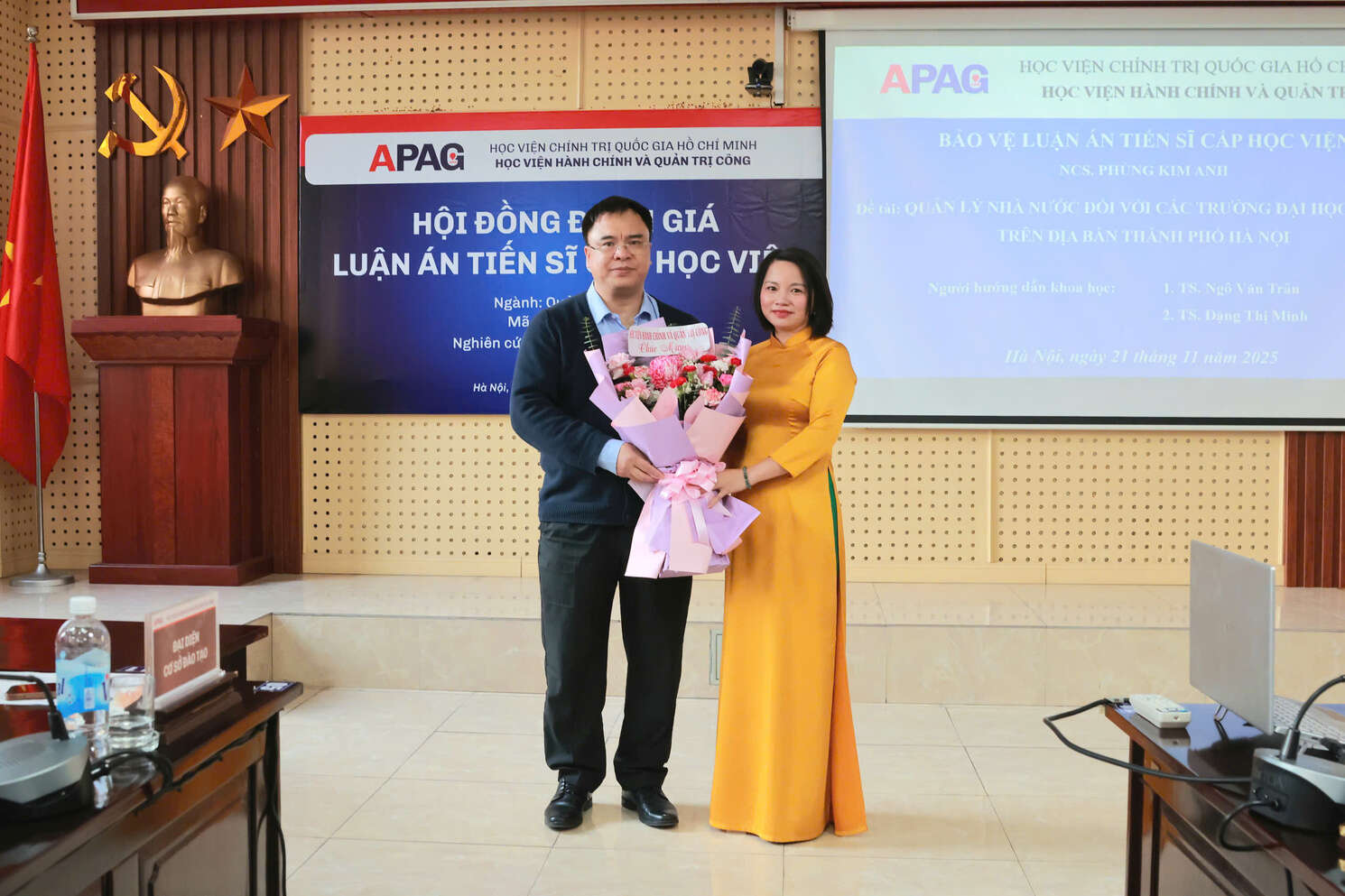 (apag.edu.vn) - Chiều ngày 21/11/2025, Học viện Hành chính và Quản trị công tổ chức Lễ bảo vệ luận án tiến sĩ cấp Học viện cho nghiên cứu sinh Phùng Kim Anh, chuyên ngành Quản lý công, mã số 9340403, với đề tài “Quản lý nhà nước đối với các trường đại học tư thục trên địa bàn thành phố Hà Nội”. Luận án được thực hiện dưới sự hướng dẫn khoa học của TS. Ngô Văn Trân và TS. Đặng Thị Minh, giảng viên cao cấp Học viện Hành chính và Quản trị công.