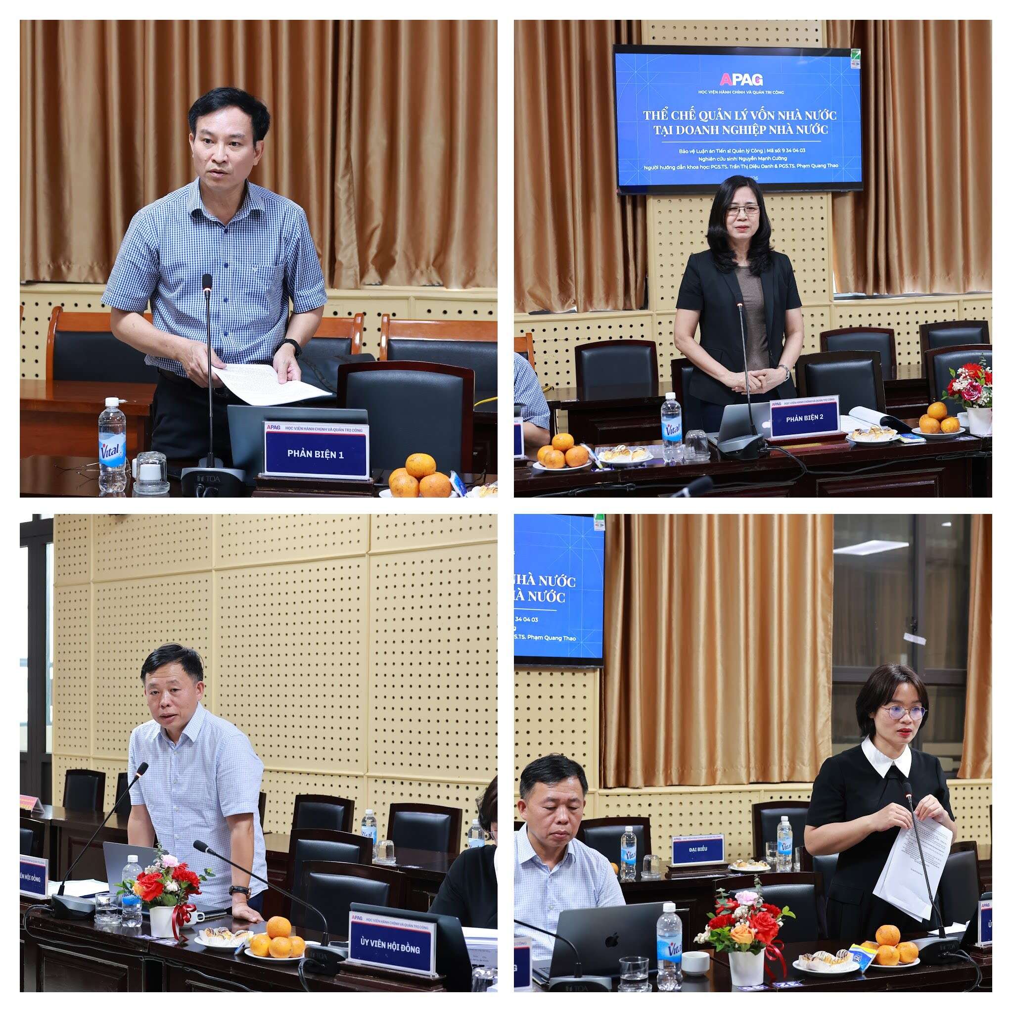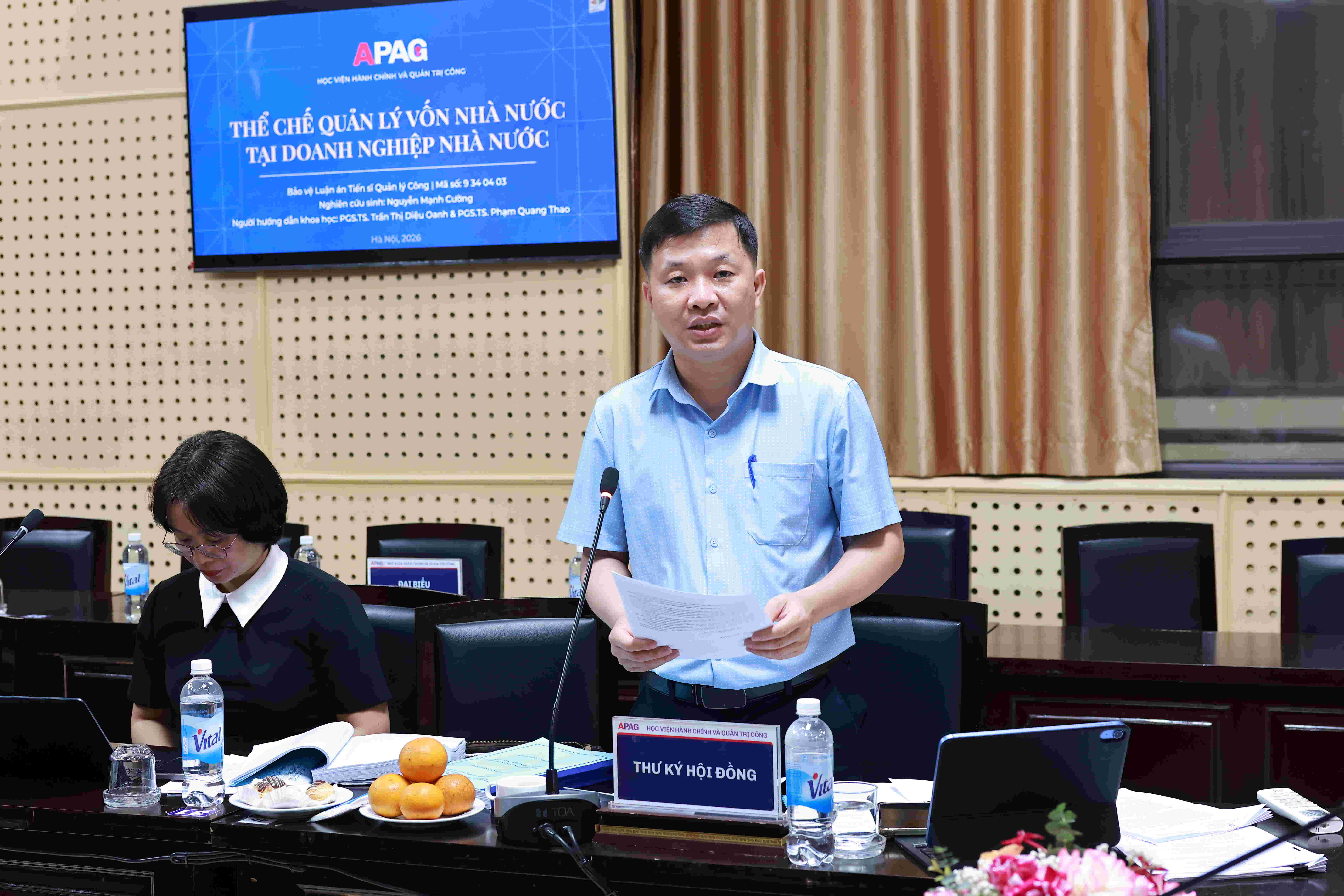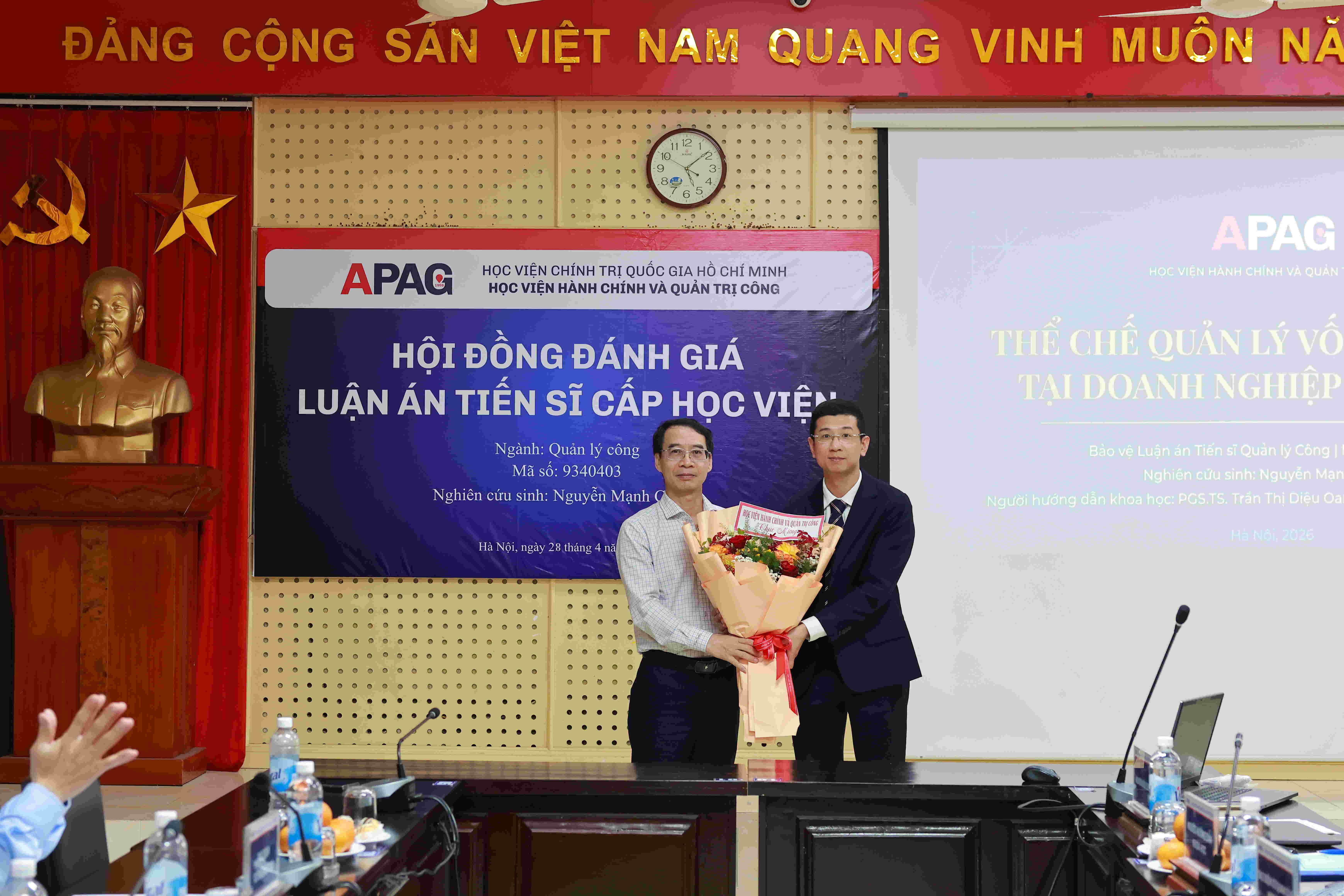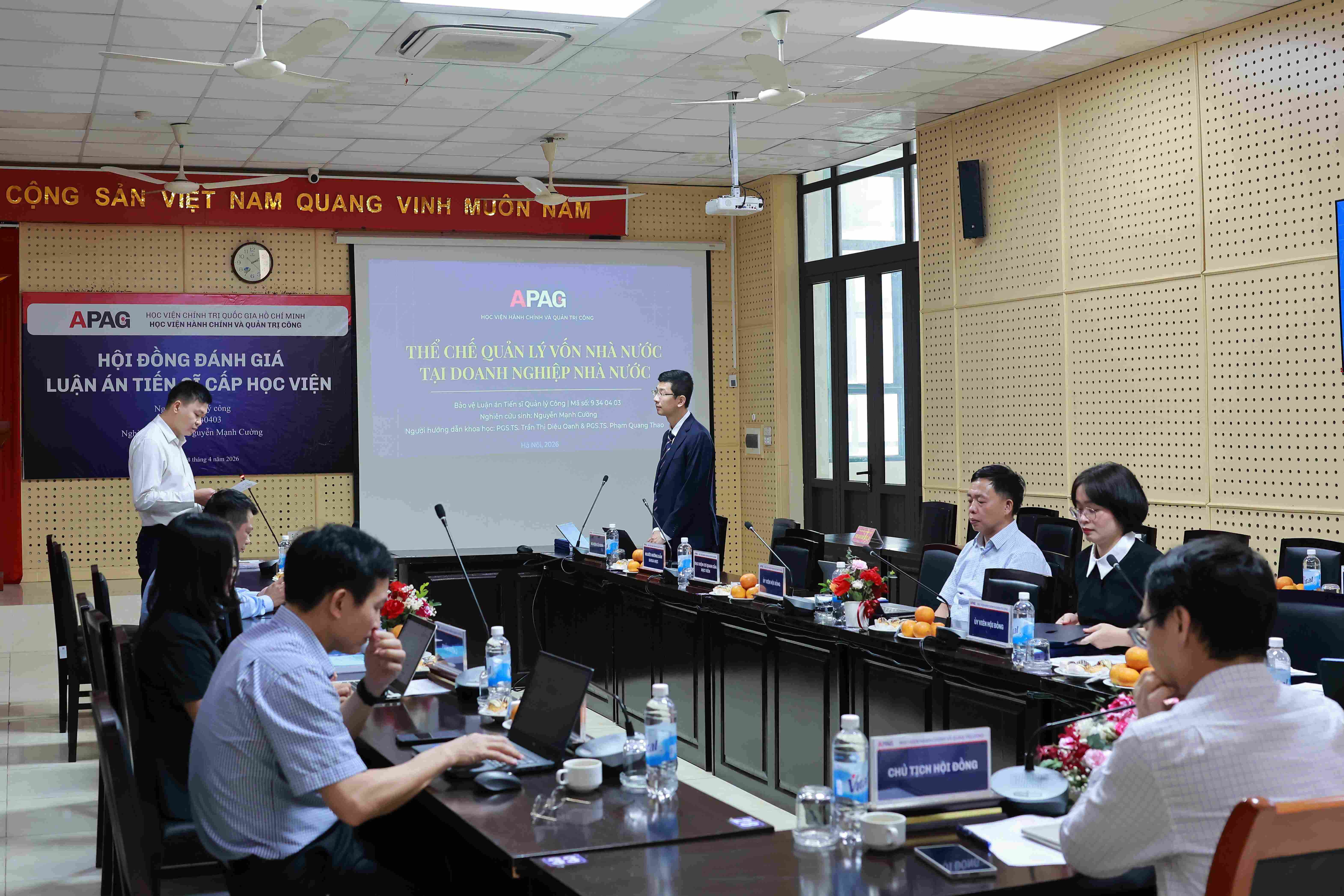 (apag.edu.vn) - Chiều ngày 28/4/2026, tại Hà Nội, Học viện Hành chính và Quản trị công tổ chức Hội đồng đánh giá Luận án Tiến sĩ cấp Học viện của nghiên cứu sinh Nguyễn Mạnh Cường, ngành Quản lý công, mã số 9 34 04 03, với đề tài “Thể chế quản lý vốn nhà nước tại doanh nghiệp nhà nước” dưới sự hướng dẫn khoa học của PGS.TS. Trần Thị Diệu Oanh và PGS.TS. Phạm Quang Thao.