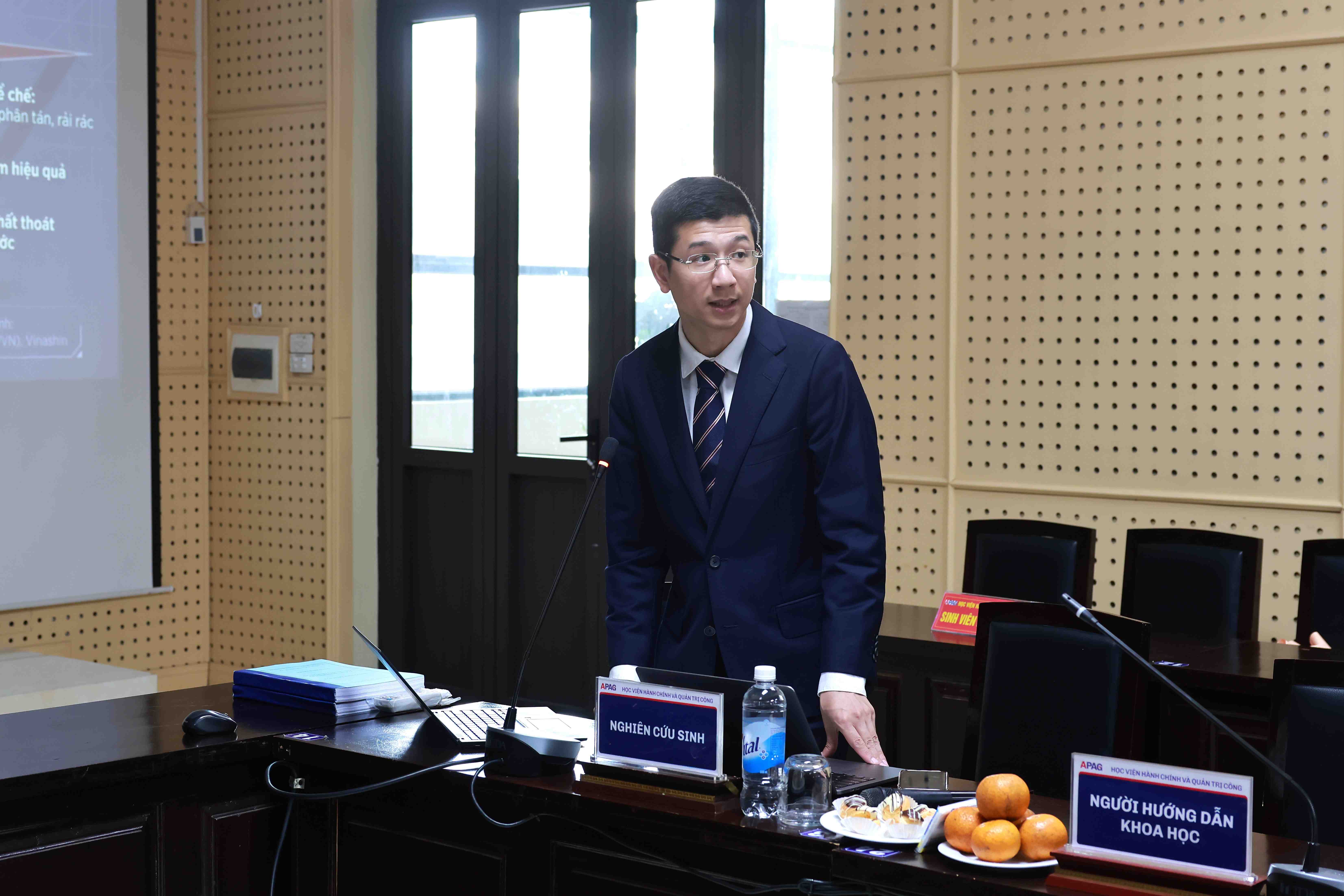 Trong phần trình bày, nghiên cứu sinh Nguyễn Mạnh Cường đã làm rõ mục tiêu nghiên cứu, cách tiếp cận và các kết quả chính của luận án. Đề tài tập trung làm rõ cơ sở lý luận và thực tiễn về thể chế quản lý vốn nhà nước tại doanh nghiệp nhà nước, đề xuất quan điểm và một số giải pháp hoàn thiện thể chế quản lý vốn nhà nước tại doanh nghiệp nhà nước ở Việt Nam.
