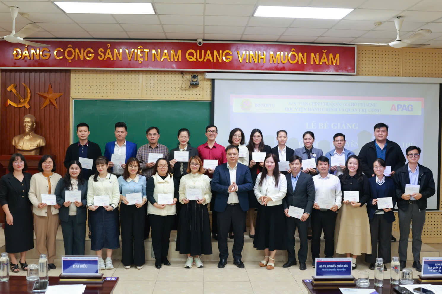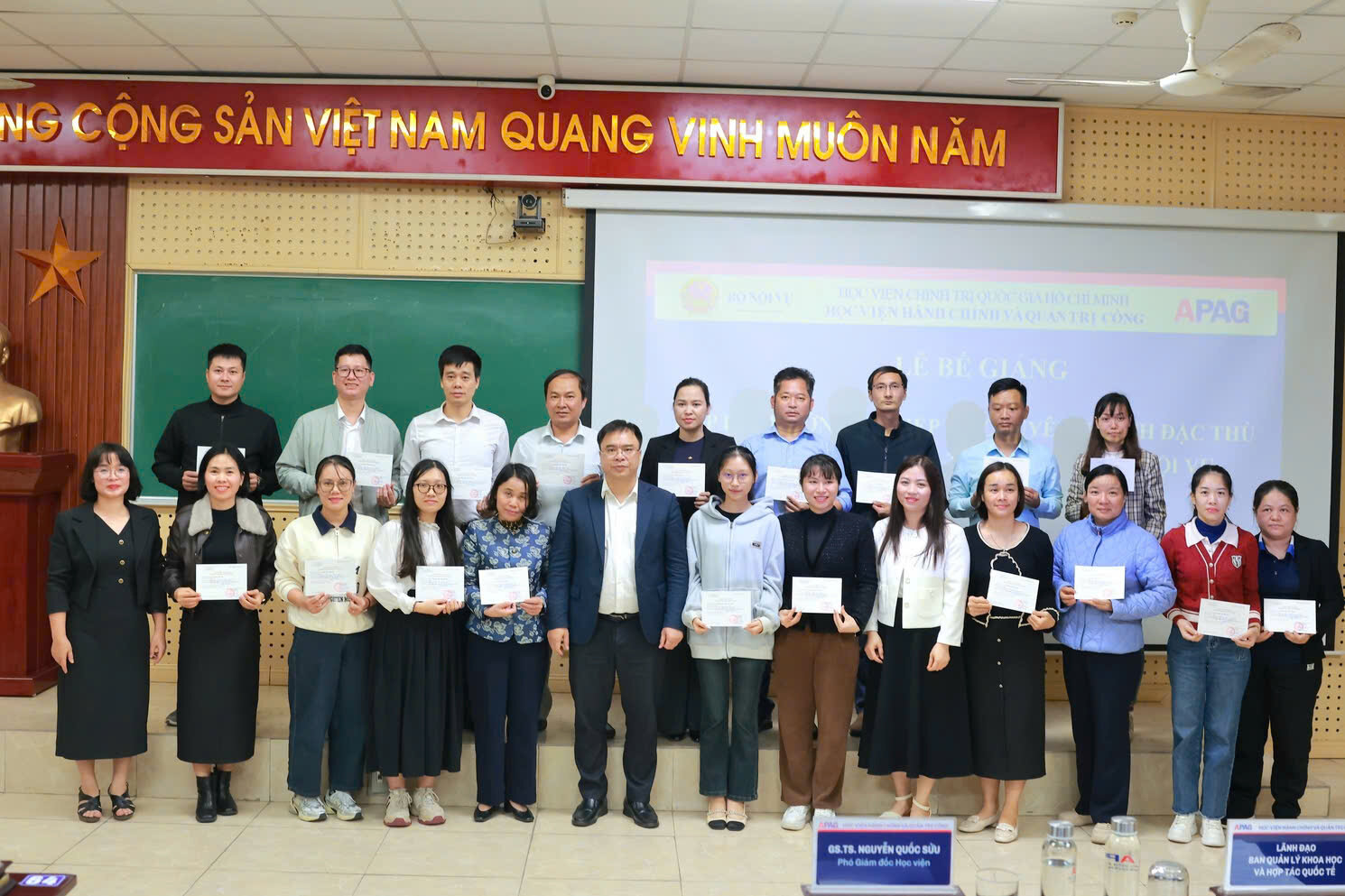 (apag.edu.vn) - Chiều ngày 13/12/2025, Học viện Hành chính và Quản trị công tổ chức Lễ Bế giảng Lớp “Bồi dưỡng nghiệp vụ chuyên ngành đặc thù cho công chức xã thuộc lĩnh vực Nội vụ” thuộc Chương trình mục tiêu quốc gia xây dựng nông thôn mới năm 2024 và năm 2025 của Bộ Nội vụ. GS.TS. Nguyễn Quốc Sửu, Phó Giám đốc Học viện dự và chủ trì buổi lễ.